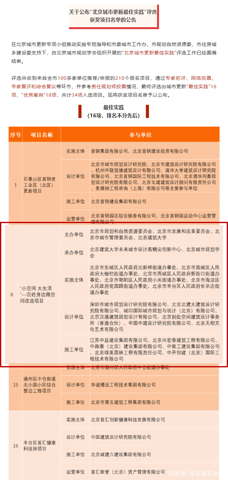 “北京城市更新最佳实践”评选活动旨在宣传北京城市更新优秀实践经验,鼓励更多市场主体参与城市更新。活动由北京城市更新专项小组推动实施专班指导,市委城工办、市住建委、市规自委提供支持,北京城市规划学会具体组织实施,主要征集自《北京城市总体规划(2016年—2035年)》批复以来,全市范围内已完成或阶段性完成并投入使用的民生改善类、产业升级类、活力提升类及其他等四类城市更新项目。评选共收到来自全市100多家单位推荐/申报的210个报名项目,通过专家初评、网络投票、专家复评和综合复议等环节,并参考责任规划师投票情况,最终评选出城市更新“最佳实践奖”16项,“优秀案例奖”18项。