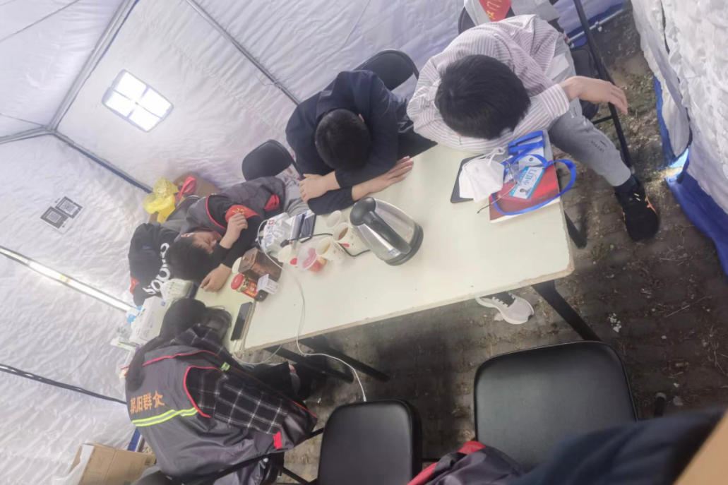 志愿者的后勤保障也在改善。开始时,只有一顶帐篷和两把椅子供大家在小区歇脚,没有热水,没有电源。刚来的第二天,就赶上降温,乡里很快给他们配备了水壶,队员们喝到热水,开心得像个孩子。