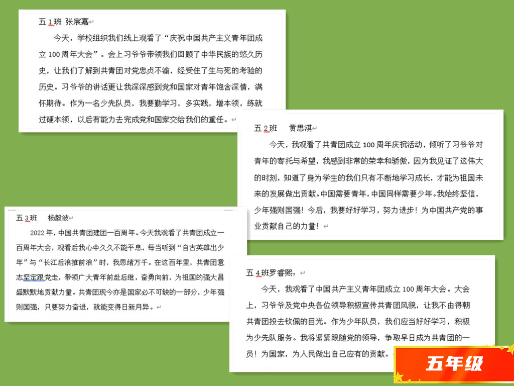 5月10日上午,庆祝中国共产主义青年团成立100周年大会在北京人民大会堂隆重举行。习近平总书记的讲话激励了史家教育集团革新里小学全体团员青年、少先队员坚定不移跟党走,在实现中华民族伟大复兴中国梦的新征程上谱写更加壮丽的青春篇章!