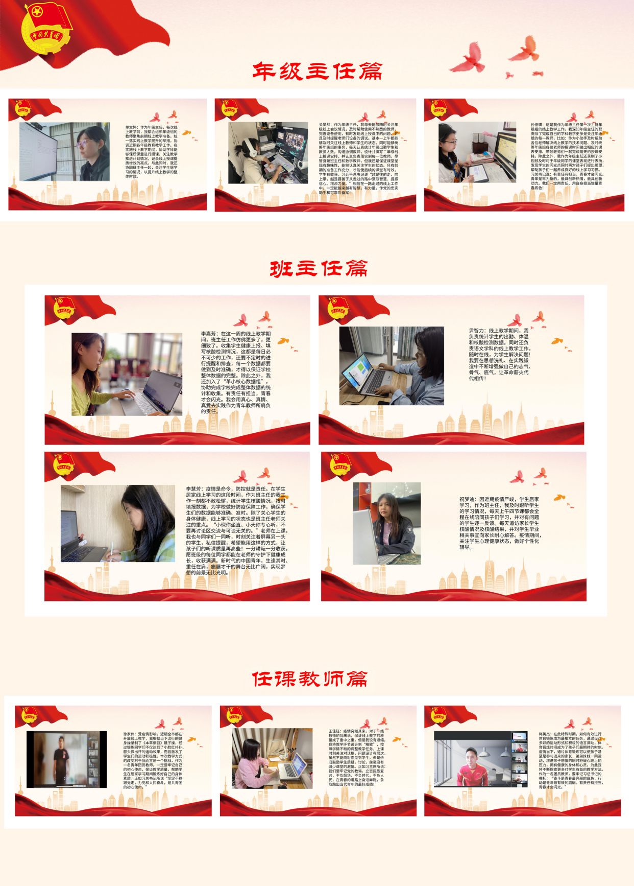 在抗击疫情的非常时期,我们每一位团员青年也都在各自岗位上践行职责,贡献力量,争先锋,做榜样。作为教育力量中最积极、最有生气的力量,他们牢记党的教诲,立志民族复兴,勇做走在时代前列的奋进者、开拓者、奉献者。
