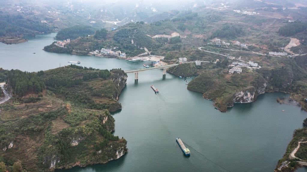 近年来,构皮滩、思林、沙沱电站大型升船机相继投入运行,乌江水道全面贯通。2021年11月,贵阳港开阳港区北上长江首航,14艘货船运载6800吨磷矿,从贵阳港开阳港区出发,前往重庆涪陵。这标志着乌江“黄金水道”全线大规模复航,500吨级船舶可直达长江。