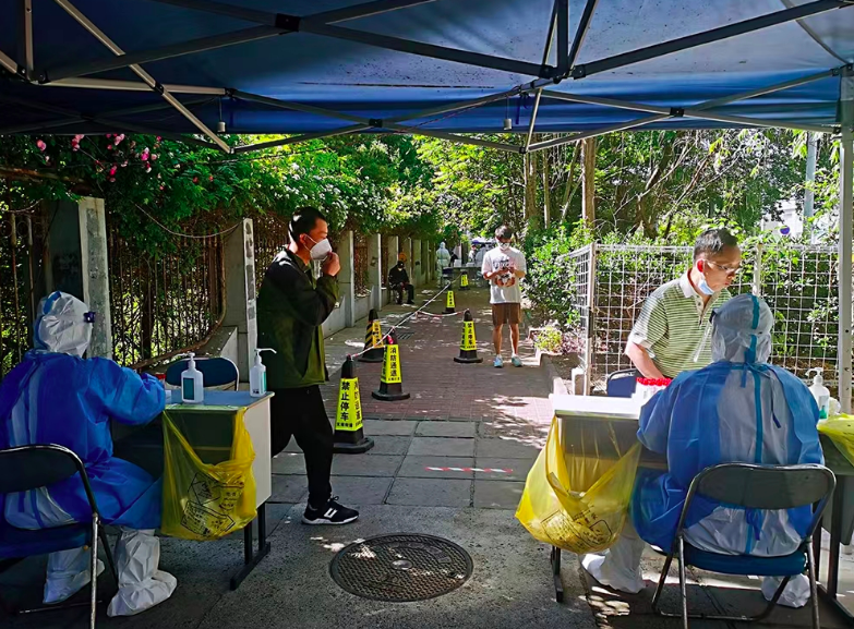路边的蔷薇开得正好,沿着院墙如瀑布般倾泻下来。等待做核酸检测的居民们边排队边赏花,无聊的等待也多了一番情趣。