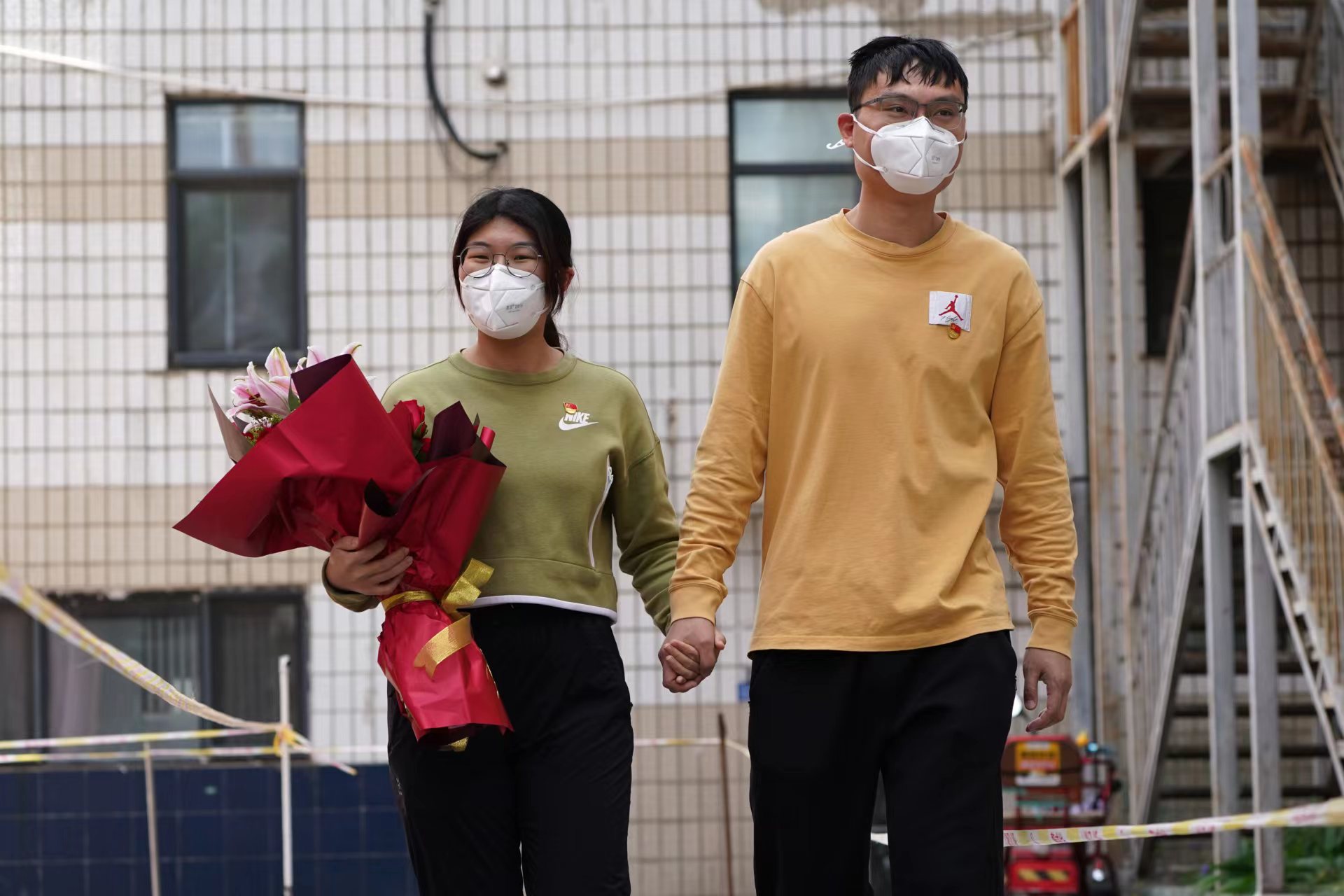 三通道的“新郎”和五通道的“新娘”整整忙碌了一上午,期间二人也无法交流,直到中午后,最后一个居民完成核酸检测,他们才脱下厚重的防护服得以相聚。全部工作完成后,社区领导准备了鲜花和大红喜字送给两位新人,既是对他们志愿服务的感谢,也是对他们的美好祝福。