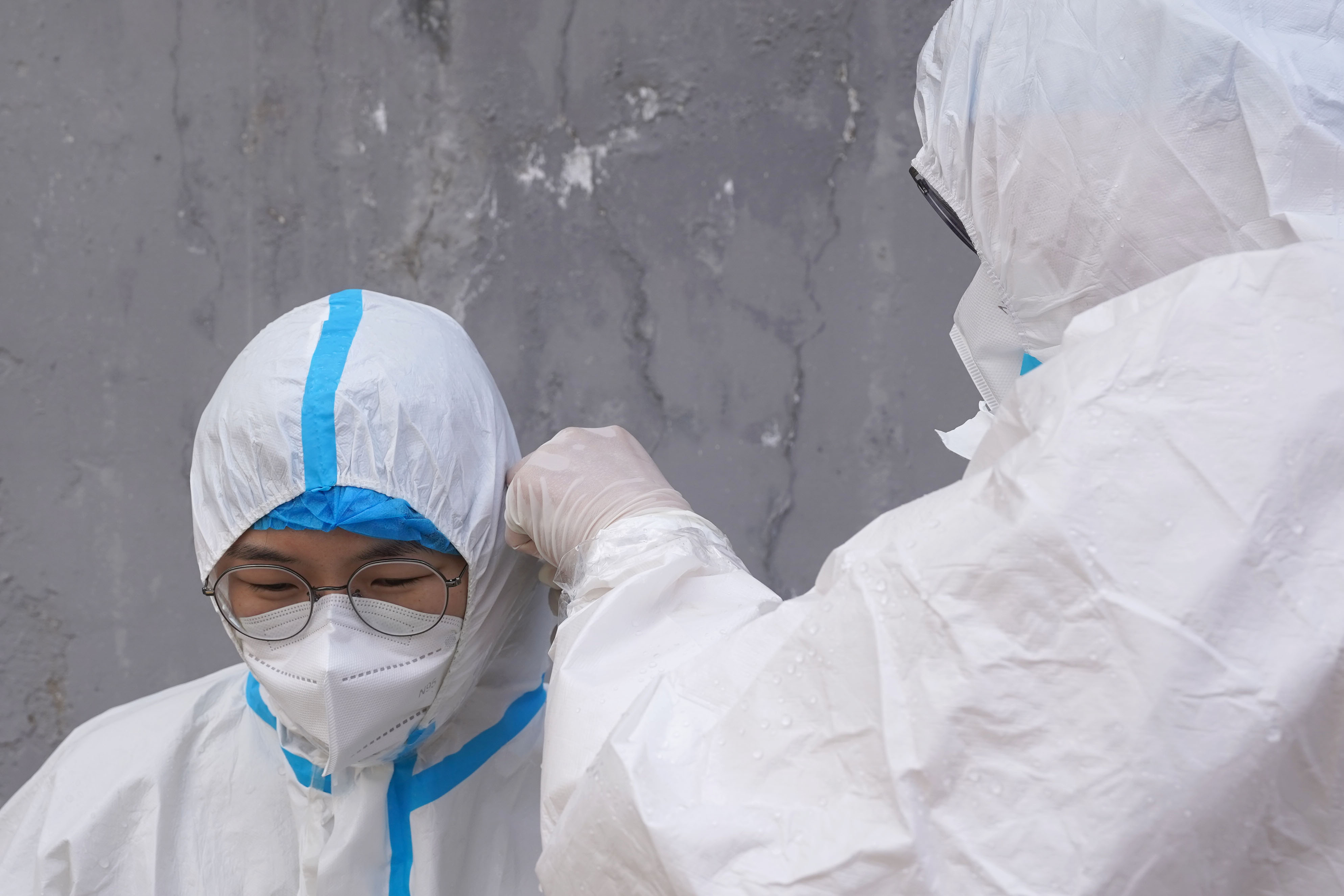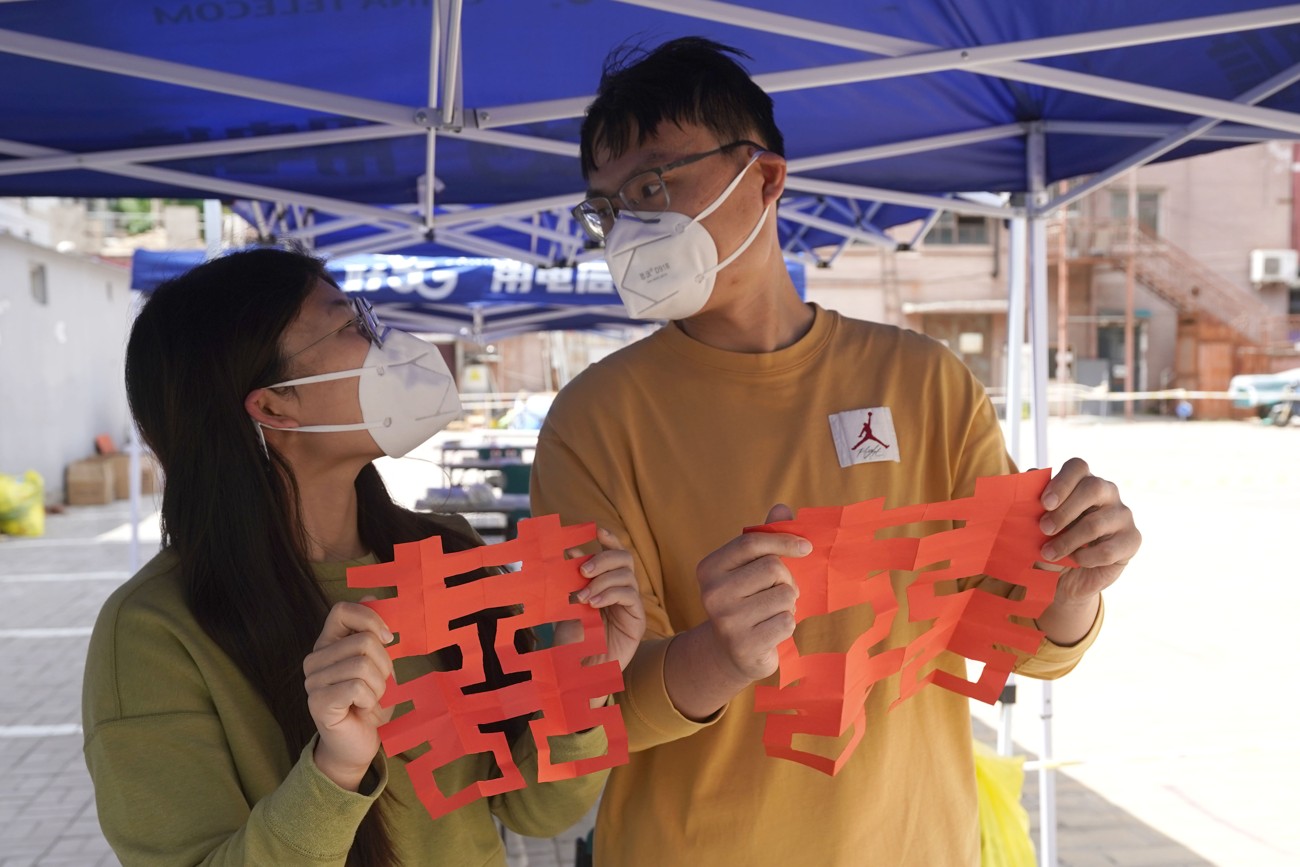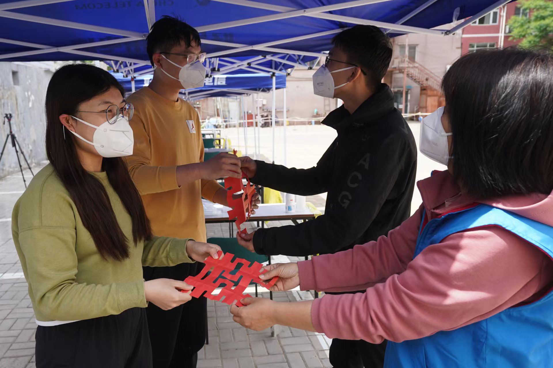 在五位负责扫描身份证的“大白”中,有一对原本今天要举行婚礼的新人。因为疫情,他们的婚礼已经取消了两次,而他们在这样的日子里,选择默默地奉献一点自己的力量,参与到社区的核酸检测志愿服务中。