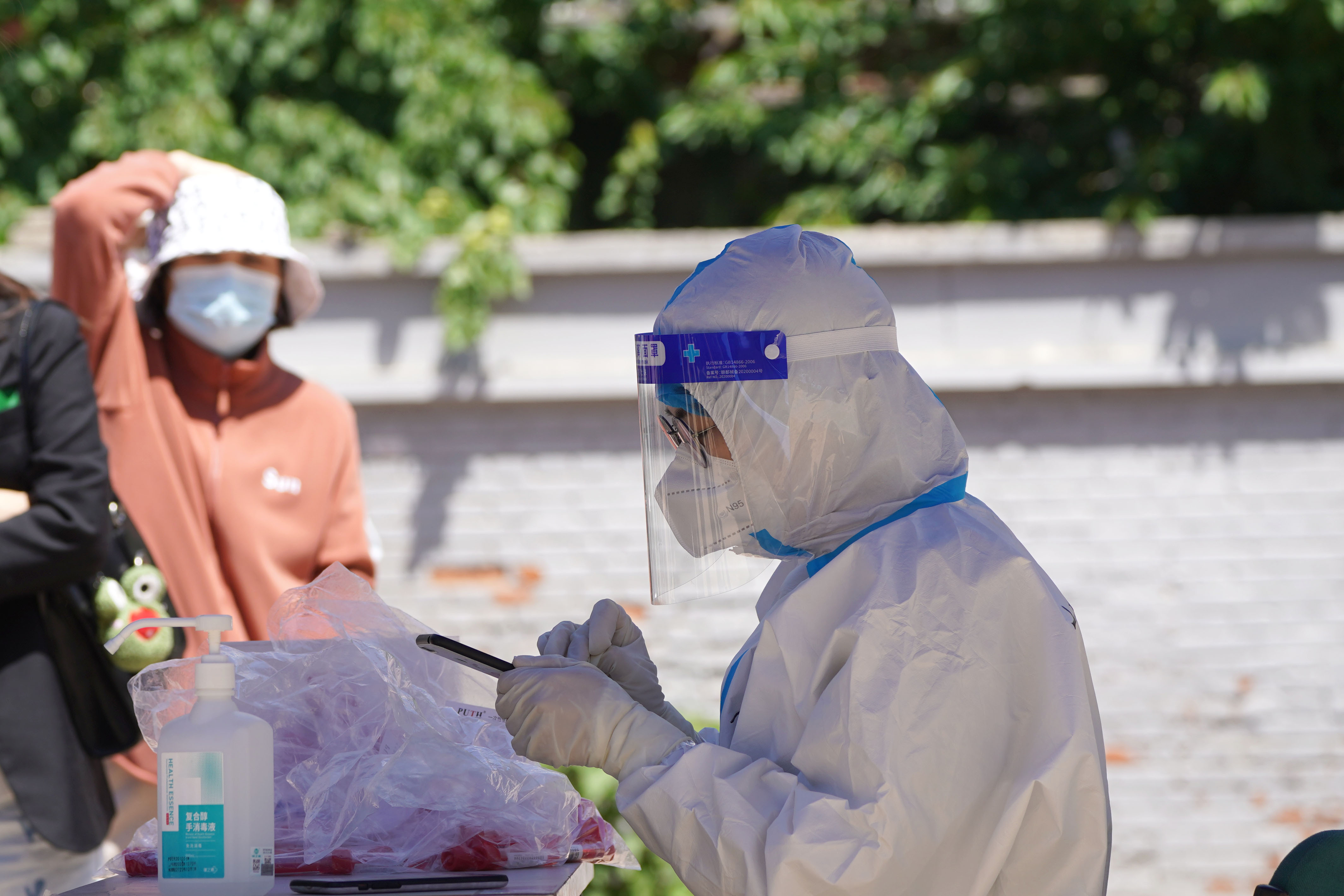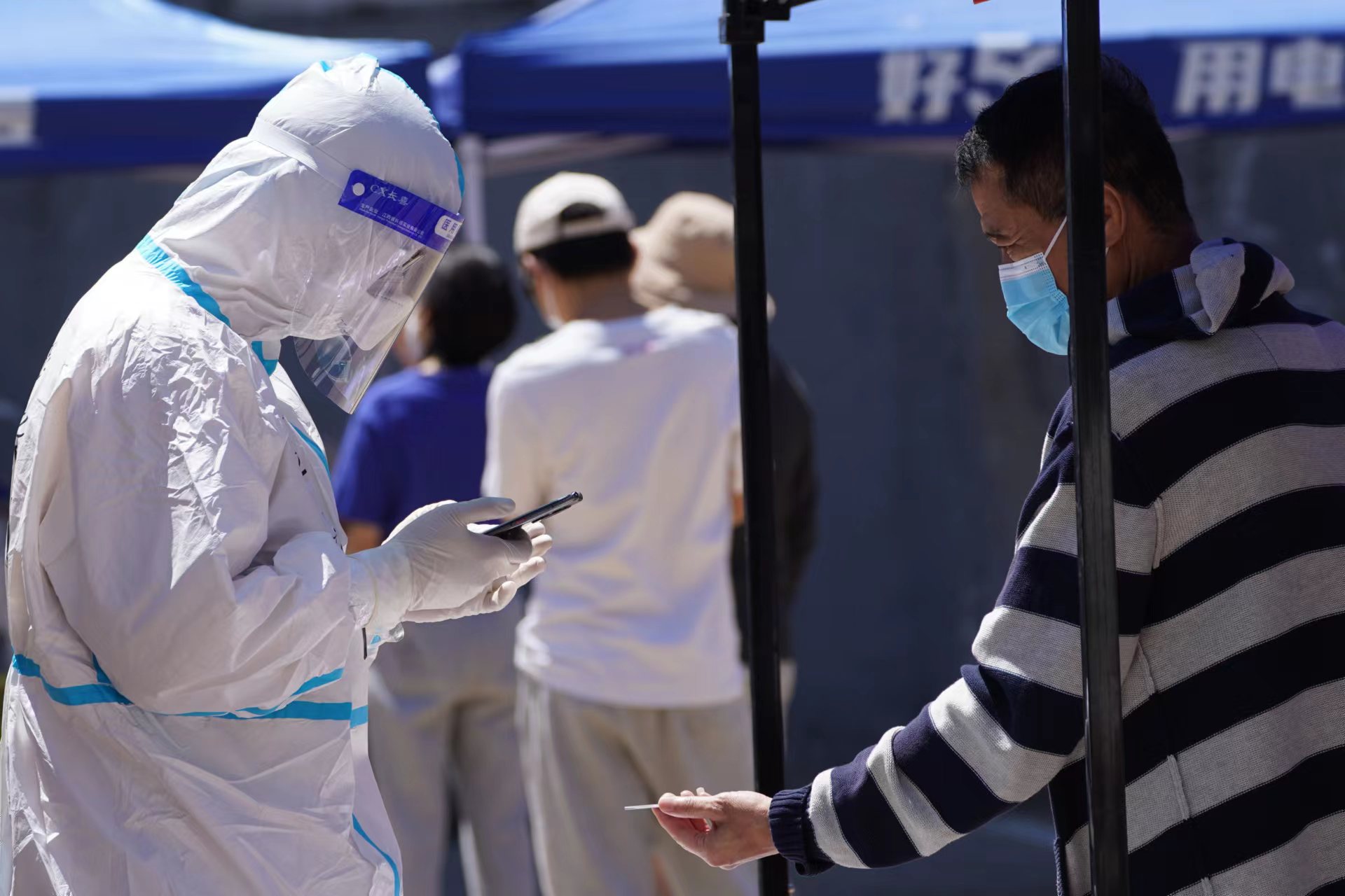 错过两次婚礼,却不错过在社区核酸检测现场做志愿者。和往常一样,学院路街道展春园社区的核酸检测工作正在有条不紊地进行着,居民十人一组整齐地排队等候,队伍最前端设有五组检测通道,身穿白色防护服的工作人员熟练地忙碌着。