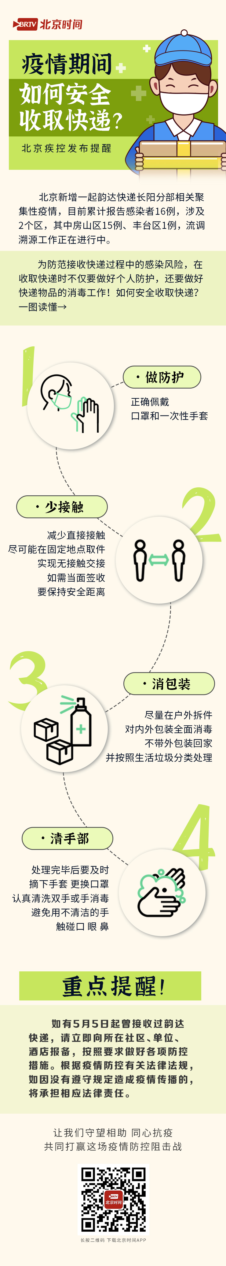 为防范接收快递过程中的感染风险,在收取快递时不仅要做好个人防护,还要做好快递物品的消毒工作!如何安全收取快递?北京疾控发布提醒,一图读懂↑↑↑