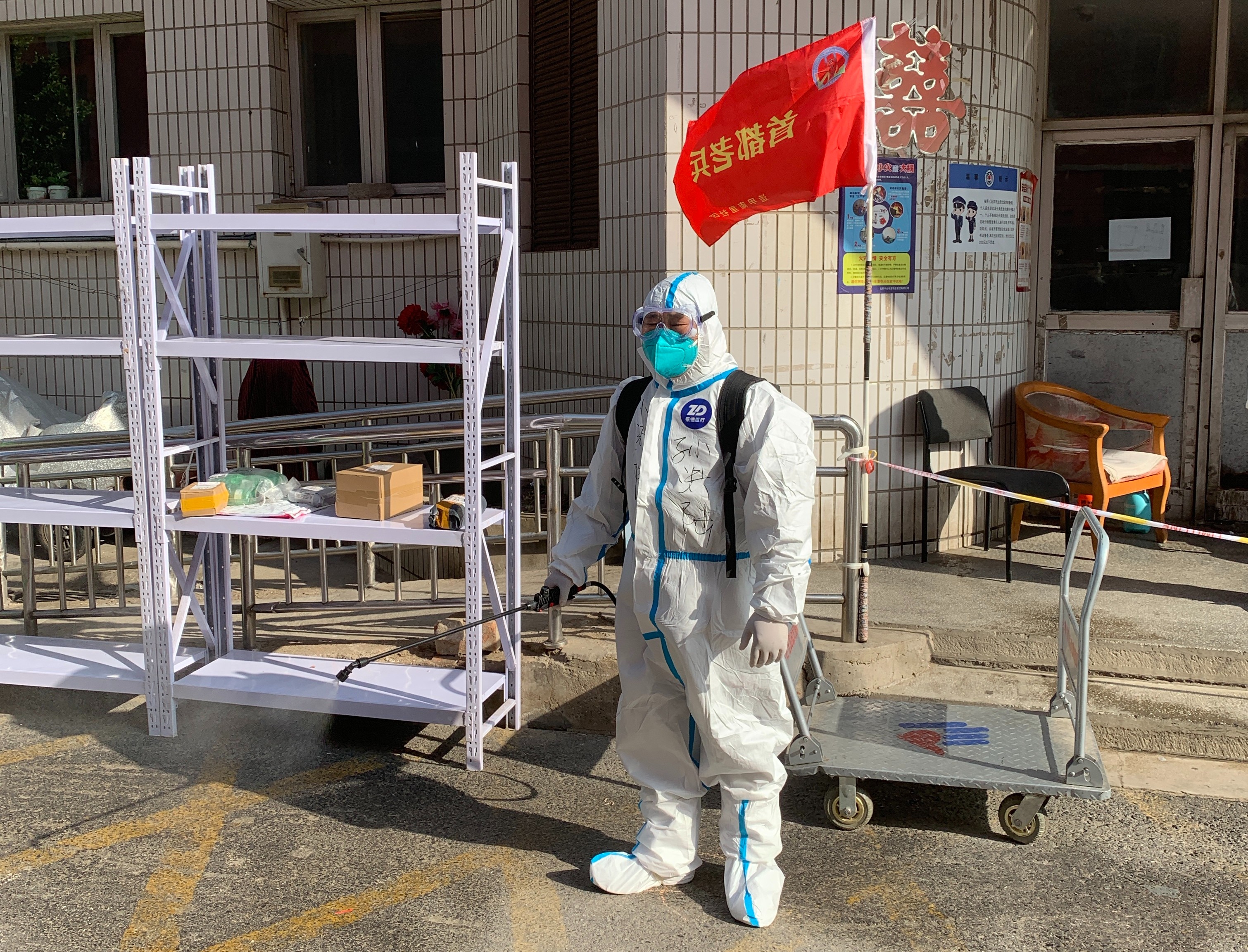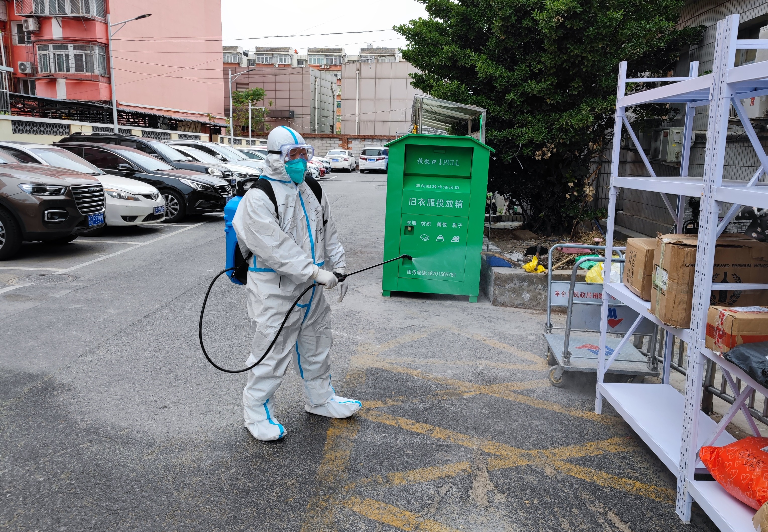 除了把生活用品、快递外卖送到居民家门口,孙洪陆还要背着三四十斤的消毒液,每天从18层走到3层,边走边消杀,一天要走两遍。