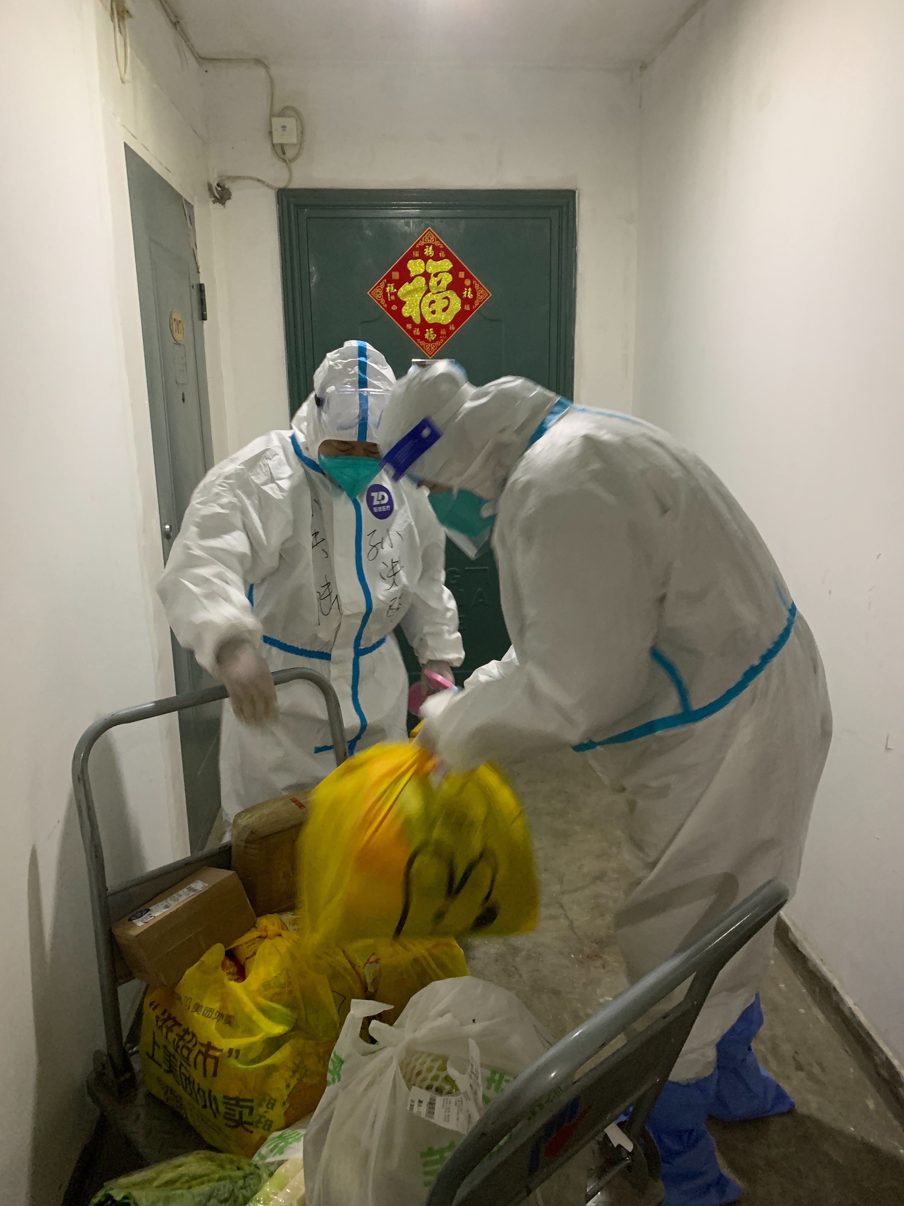 孙洪陆首先当起了“搬运工”。谁家想打纯净水,微信群里说一声,他就拿起居民放在门口的水卡和空桶,跑到楼下接水,再扛上楼。送到快递架上的包裹、外卖,他迅速消杀,再推着小车,按照订单送到家门口,敲敲门就走,保持“无接触服务”。“年轻人自己不会做饭的,订了外卖,咱们得趁热给送到家里。”孙洪陆穿着白色防护服,戴着面罩、手套,楼上楼下忙活起来,汗水很快浸湿了衣服。