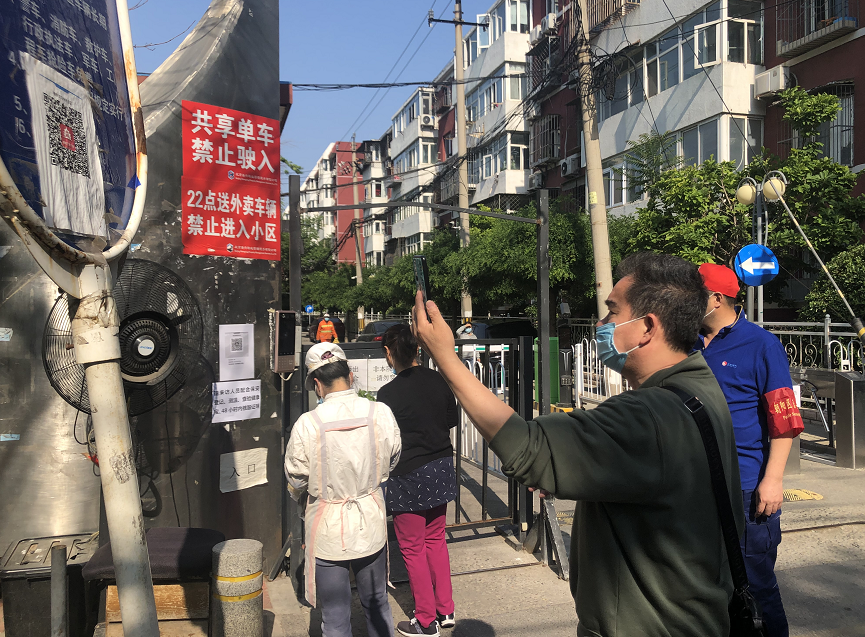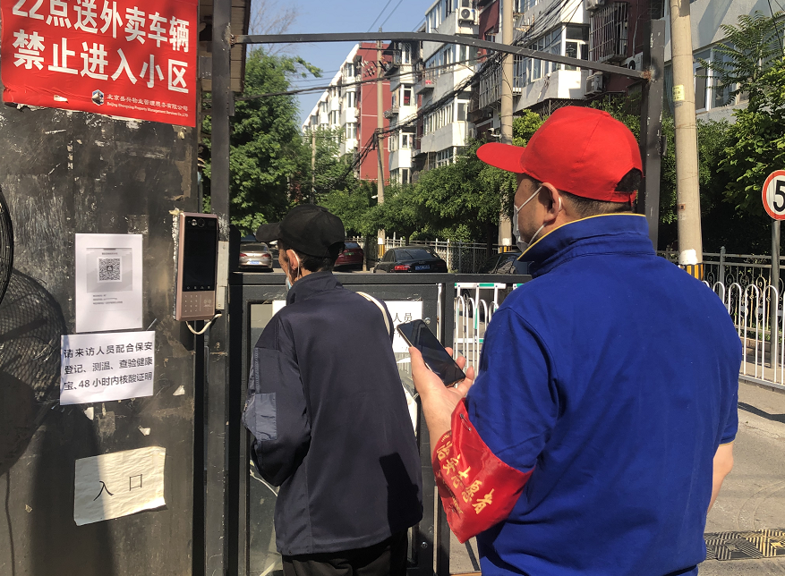 在惠新里社区,有部分小区大门前设有人脸识别设备。记者在惠新里军休所小区门前看到,一名身穿燃气集团制服的志愿者正在协助居民扫码测温,同时引导居民使用人脸识别系统,他是住在该小区的一名在职党员。