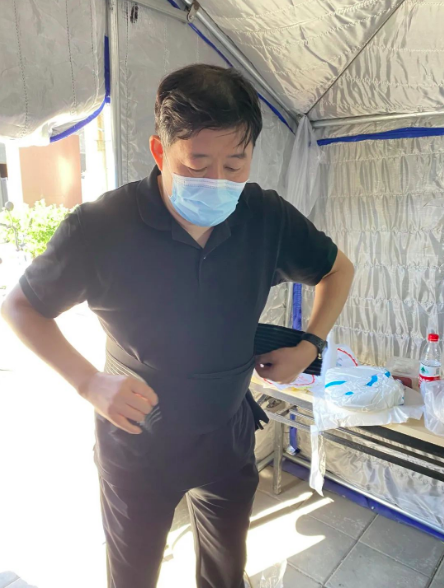 在核酸检测现场,大家看到的是性格开朗、善于沟通的刘路明总是站得笔直,声音洪亮。但很多人不知道的是,年近59岁的他,白色的防护服下一直绑着宽宽的护腰。和大多数法院干警一样,长年的伏案工作导致他患有腰椎间盘突出和腰椎滑脱,再加上身体的其他疾病,刘路明先后上过5次手术台,至今颈椎里还藏着8颗钢钉。可就是这样一个还有1年就要退休的老法院人,不仅站好了本职工作的最后一班岗,还主动“披甲上阵”,要求支援社区核酸筛查一线。
