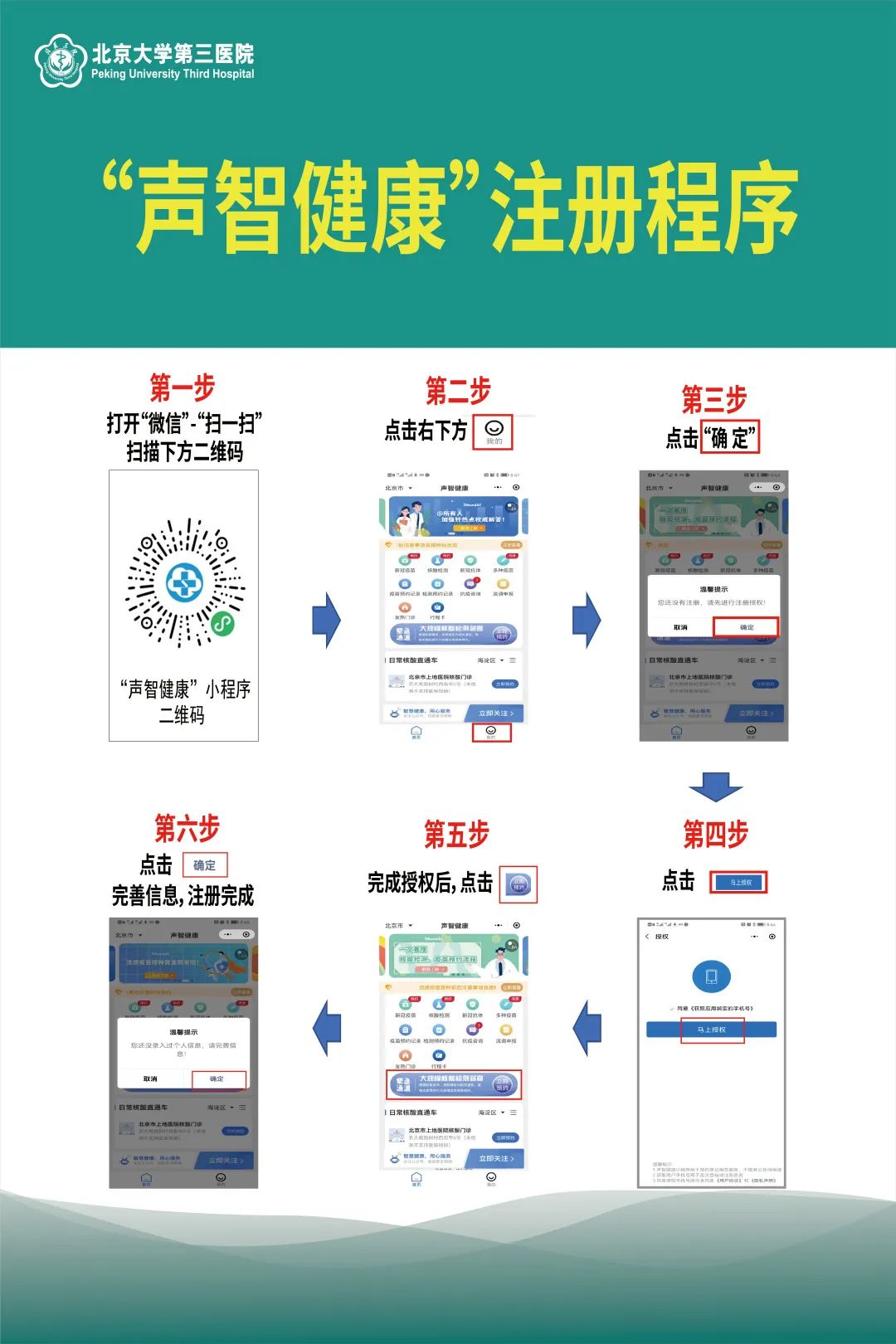 为减少您在筛查过程的等待时间,请您预约挂号成功后,在来院前通过微信扫描下方二维码,完成"声智健康"信息注册。(在“声智健康”首页,点击右下方“我的”)