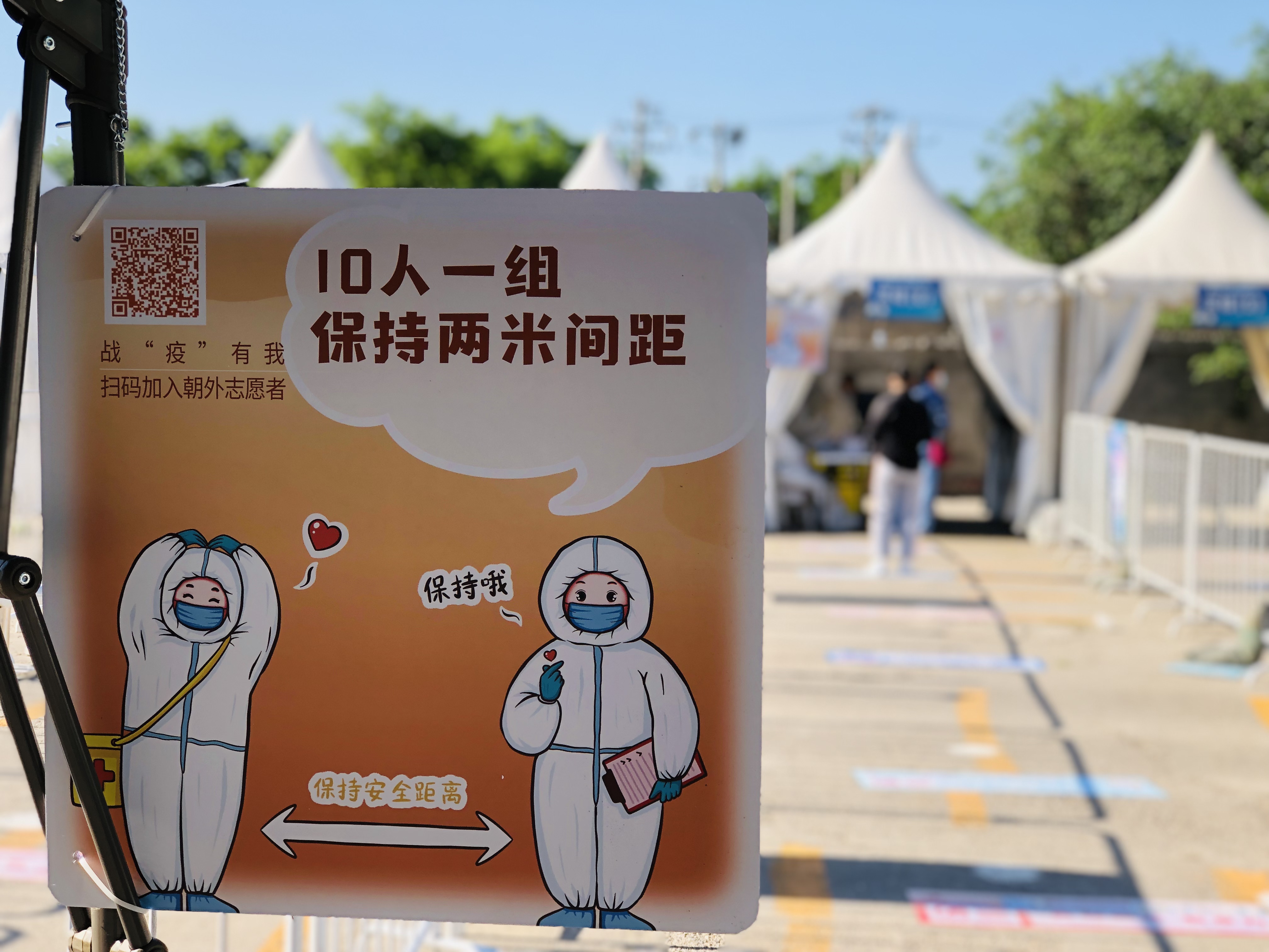 值得一提的是,作为“陪伴式”服务的重要一环,朝外街道还动员居民参与,激活邻里相伴的力量。朝外街道张贴的温馨提示、“两米线”标识,其提示语均来自街道社会动员平台“伴儿”APP的“战疫有我”主题线上征集。共有100多位居民发布了提示语,并以此为契机加入核酸筛查志愿者队伍中。