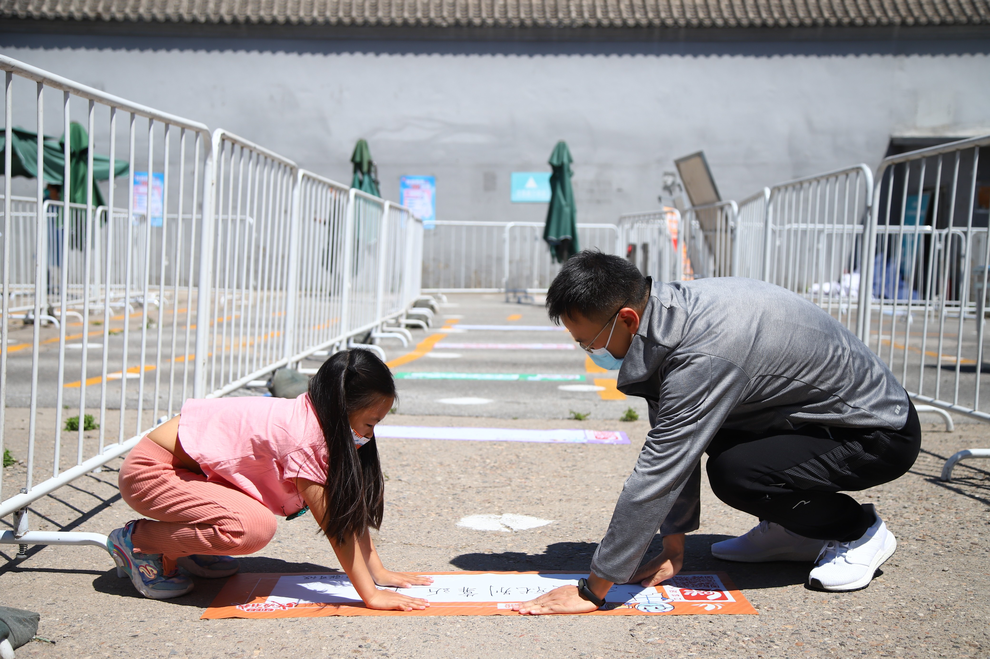 来自芳草地国际学校一年级的张可欣正是书写温馨提示“两米线”的居民之一。5月15日,她与父母一同在“两米线”标识中写下“排队别着急,核酸我陪你”“距离产生美”等话语,并张贴在核酸筛查点位的通道中。