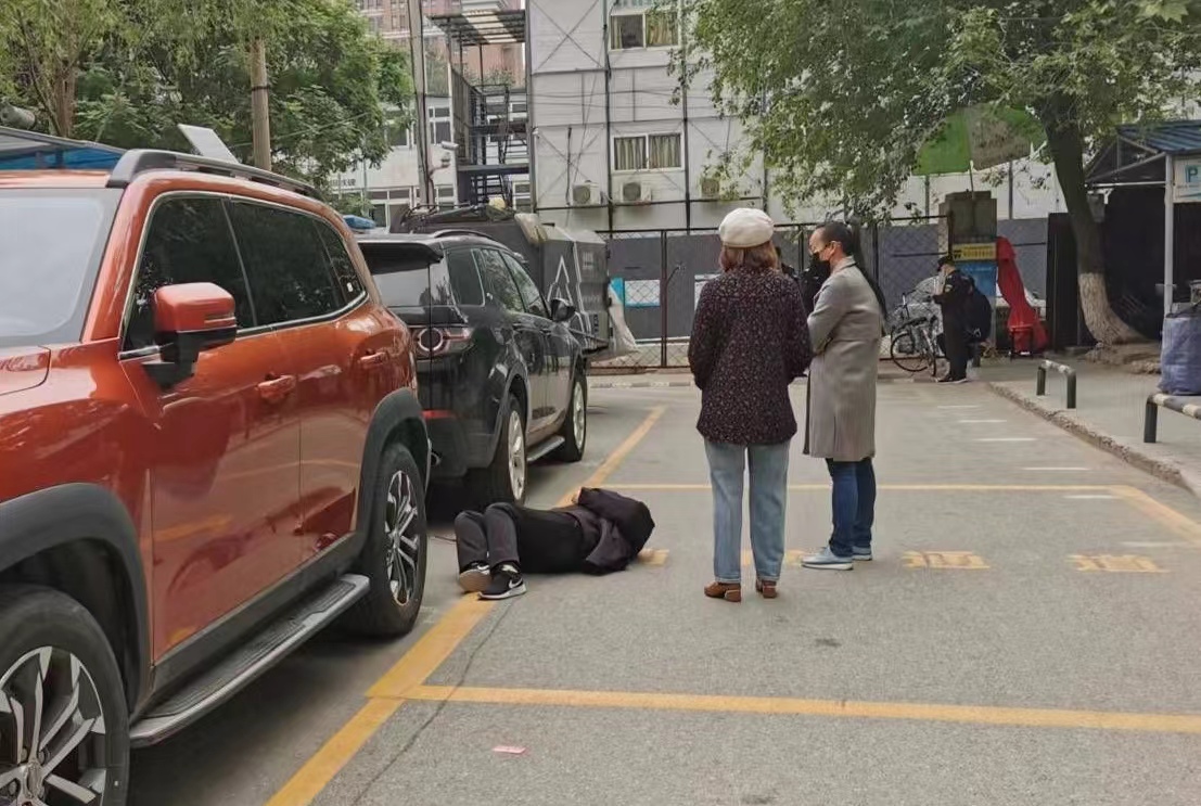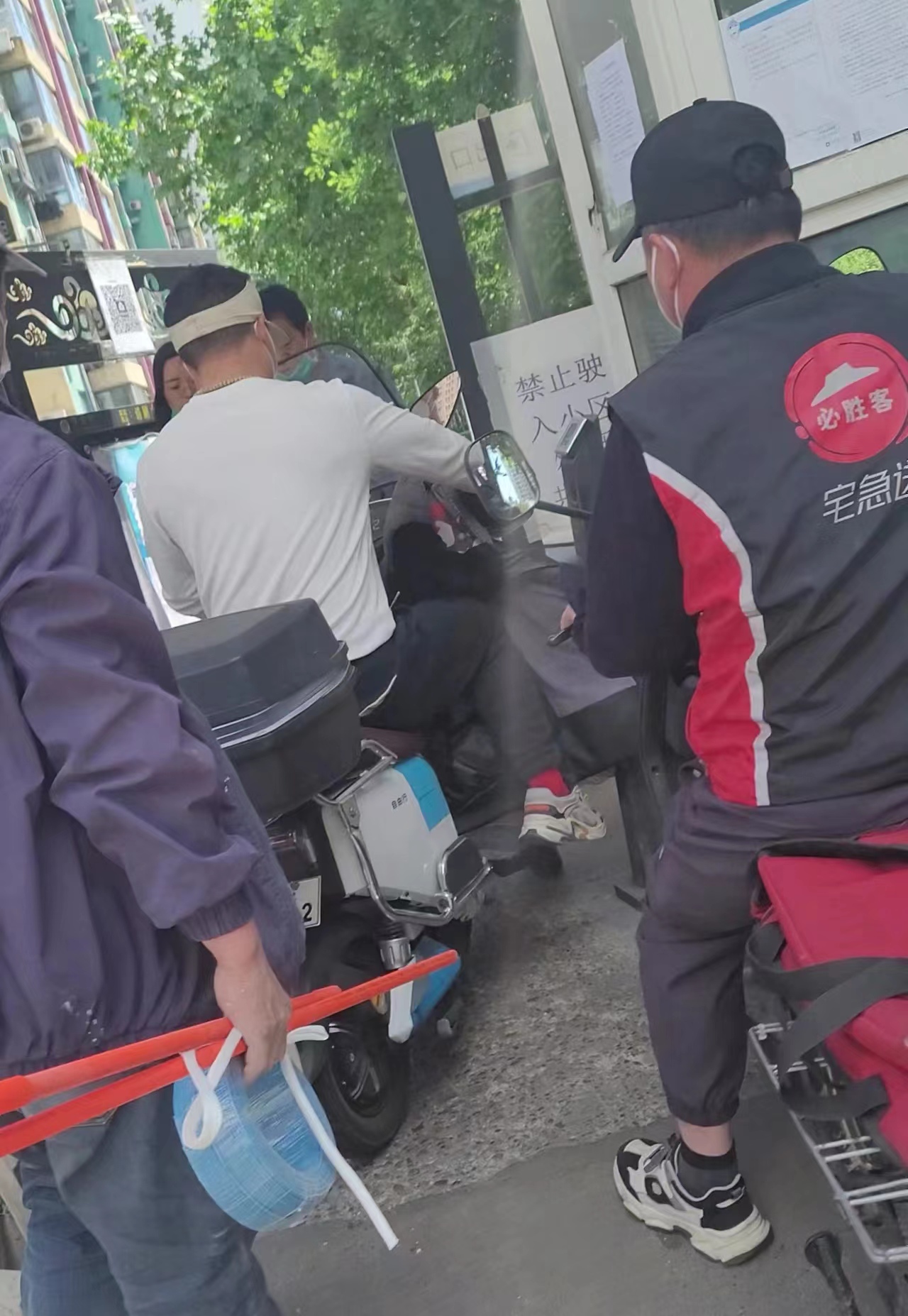小区西门无人值守,西北门内则站着几名保安。记者突然看到一群居民正围着一名躺在地上的女保安,“我头很疼,”该名女保安说,是一名骑摩托车的外卖小哥把她拖倒了,“我让他扫码,他不扫。”
