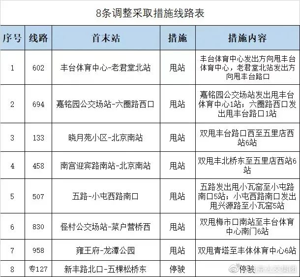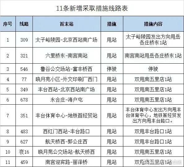 按照防疫工作要求,自5月17日12时起,在前期途经岳各庄、青塔街道周边线路采取措施的基础上,扩大措施范围,对途经区域周边的19条公交线路新增、调整临时调度措施,详见附表。