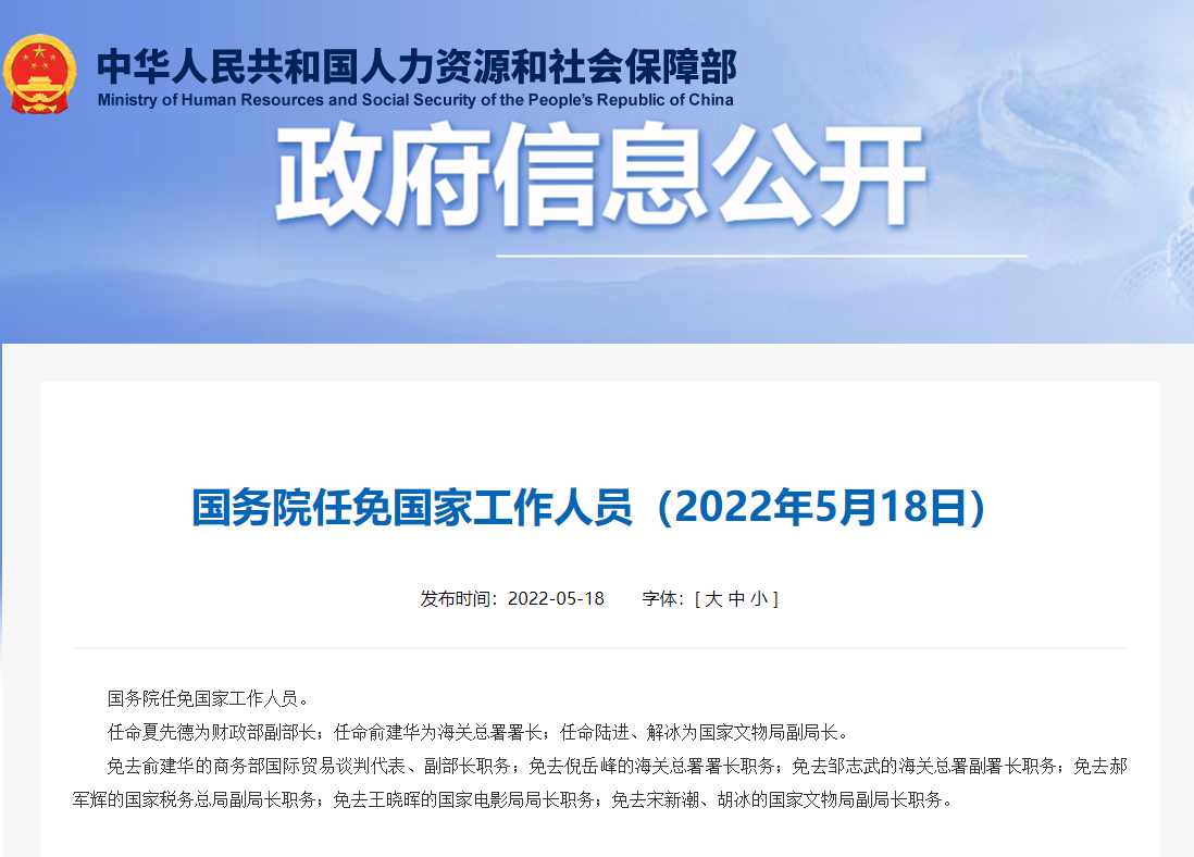 免去俞建华的商务部国际贸易谈判代表、副部长职务;免去倪岳峰的海关总署署长职务;免去邹志武的海关总署副署长职务;免去郝军辉的国家税务总局副局长职务;免去王晓晖的国家电影局局长职务;免去宋新潮、胡冰的国家文物局副局长职务。