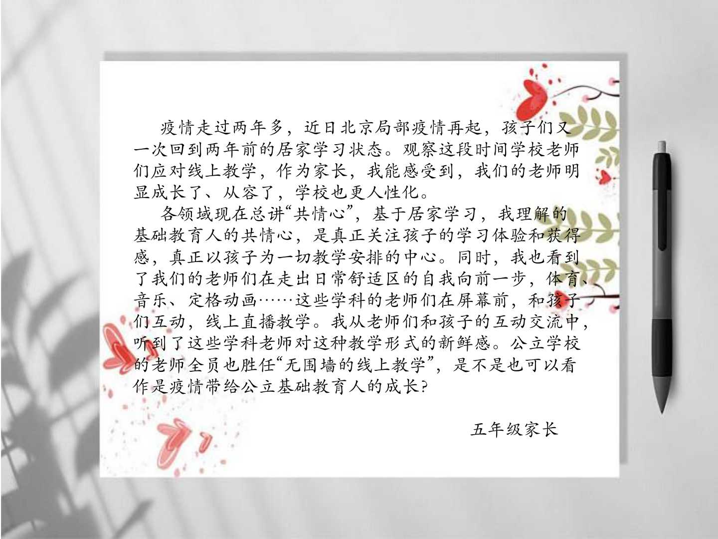 老师们,我们要肩负育人的使命,在线上教学中要攻坚克难、提质增效。我们要坚持向上,向阳、向善的心态,向学生传播正言、正语,正思维