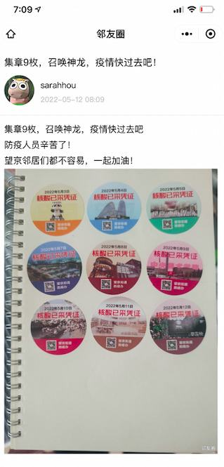 方舟苑小区的曹可然小朋友参加核酸检测次次不落,她已经集齐了15种花样不同的贴纸,她说,“最爱的还是机甲大熊猫,没有之一。”一位年轻人笑称:“集成所有贴纸就可以召唤神龙,打败新冠病毒!”还有一位网友在望京网上写下了《疫情之下,失而复得的核酸采集小标签》,他面对失而复得的小贴纸,表达自己的喜悦之情,同时也希望疫情早点过去。