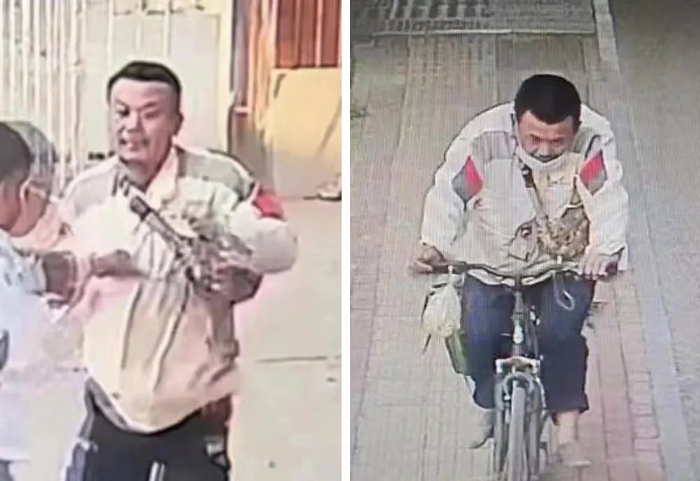 性别:男,年龄:42岁左右,身高:约1.7米,短发,中等身材,走路及骑自行车时驼背,骑一辆黑色自行车,后轮右侧装有篮筐,逃跑时上身着灰白色广汽本田工作服,后背上方印有“广汽HONDA”字样,肩臂部有灰色、红色条纹,下身穿深色裤子,斜挎迷彩挎包。此人持凶器作案,逃跑后随身可能携带刀具等凶器。