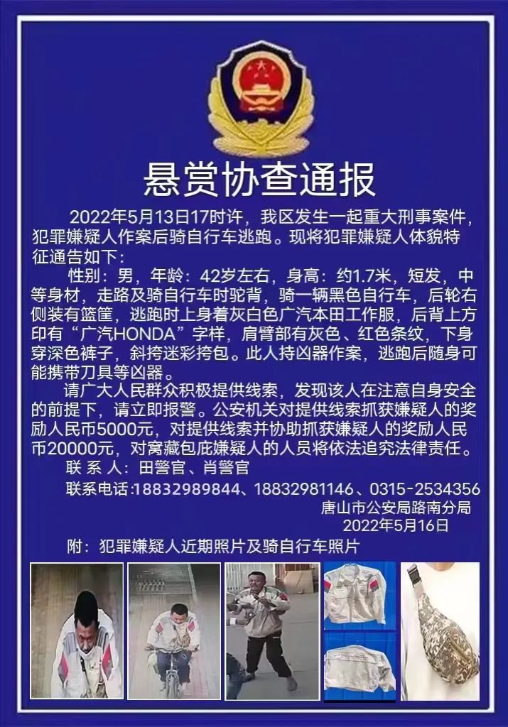 5月16日,河北省唐山市公安局路南分局发布一则悬赏协查通报。通报称,2022年5月13日17时许,唐山市路南区发生一起重大刑事案件,犯罪嫌疑人作案后骑自行车逃跑。犯罪嫌疑人体貌特征如下: