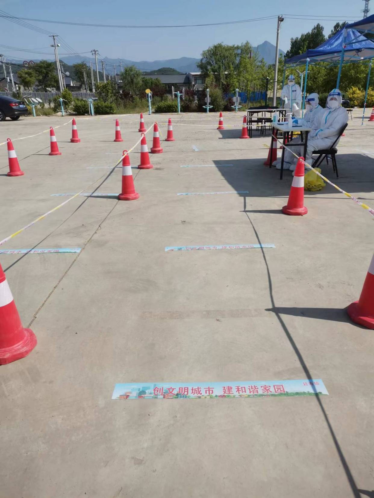 在延寿镇南庄村核酸采样点,地面上每隔两米便贴有“创文明城市 建和谐家园”创城口号的“两米线”贴纸,普通的距离线、安全线变成了文明创城宣传线,成为了核酸检测现场的一道道靓丽“装饰线”,点缀了原本枯燥的排队时光。