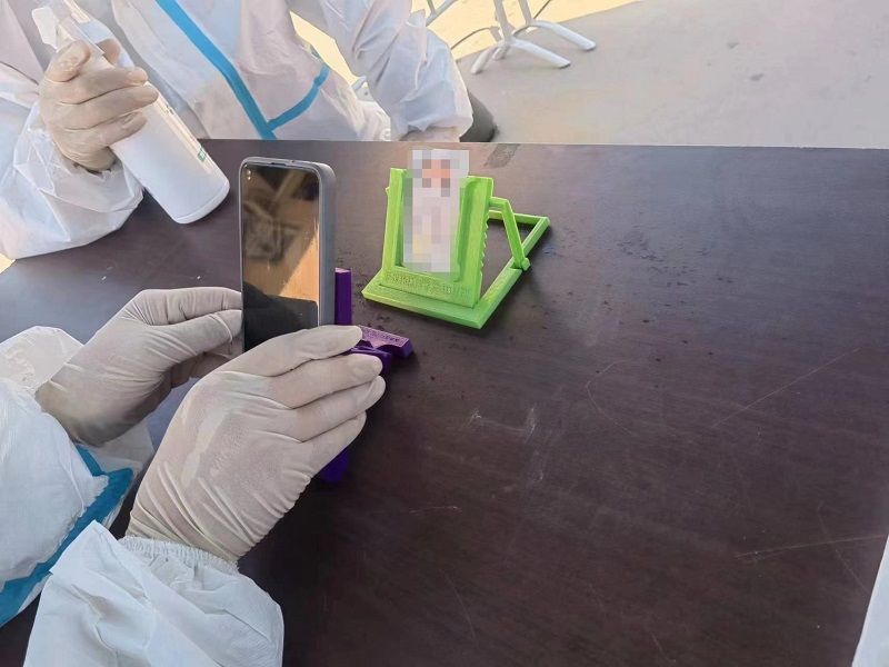 登记“神器”包含手机支架与身份证支架,前来采样的居民只需将身份证放到支架上的卡槽里,工作人员的手机放置在手机支架上保持不动,当居民把身份证放进卡槽时,手机摄像头正好可以不偏不倚地进行扫描登记,而且工作人员也不会因为经常举着手机而感到手酸。