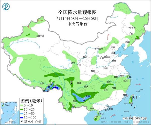 明天,新疆南疆西部、西藏东南部、四川西南部、云南东部和南部、贵州东部和南部、湖南中南部、江西西南部、广西中北部、广东北部、台湾岛等地的部分地区有中到大雨,其中广西西部和北部、西藏东南部等地局地暴雨。