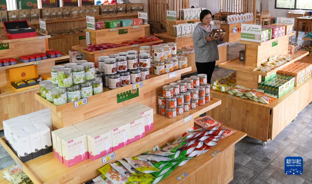 5月11日,大湾村村民陈泽申在自家老宅里整理货架,货架上码放着木耳、香芋干等当地特产。新华社记者 杜宇 摄