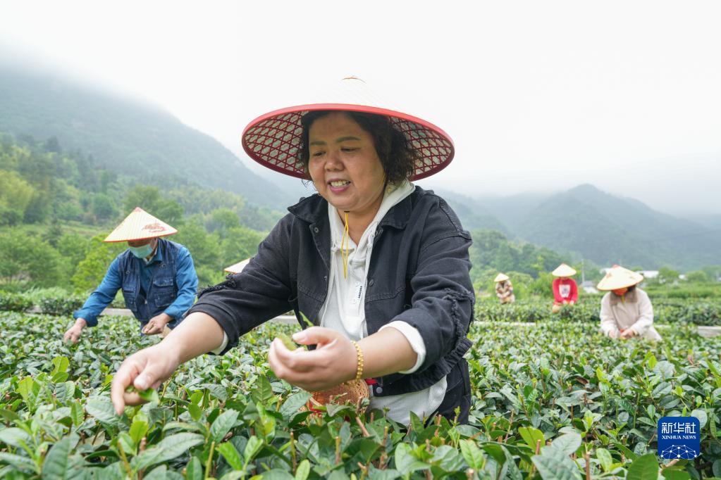 5月11日,村民在大湾村生态茶园内采摘茶叶。新华社记者 杜宇 摄