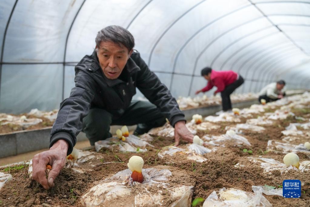 5月11日,在大湾村农光互补示范项目内,村民在太阳能板下的大棚中管护种植的灵芝。新华社记者 杜宇 摄