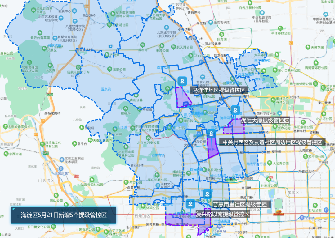 为遏制疫情扩散蔓延,保障群众健康安全,按照“非必要不流动”原则,经研判,自5月21日12时至5月28日12时(暂定),海淀区全域实行提级管控措施。