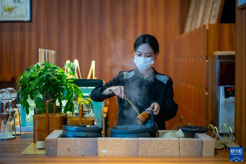 云南勐海大益茶庭的茶艺师陈夷在制作冰滴普洱茶(5月10日摄)。新华社记者江文耀摄