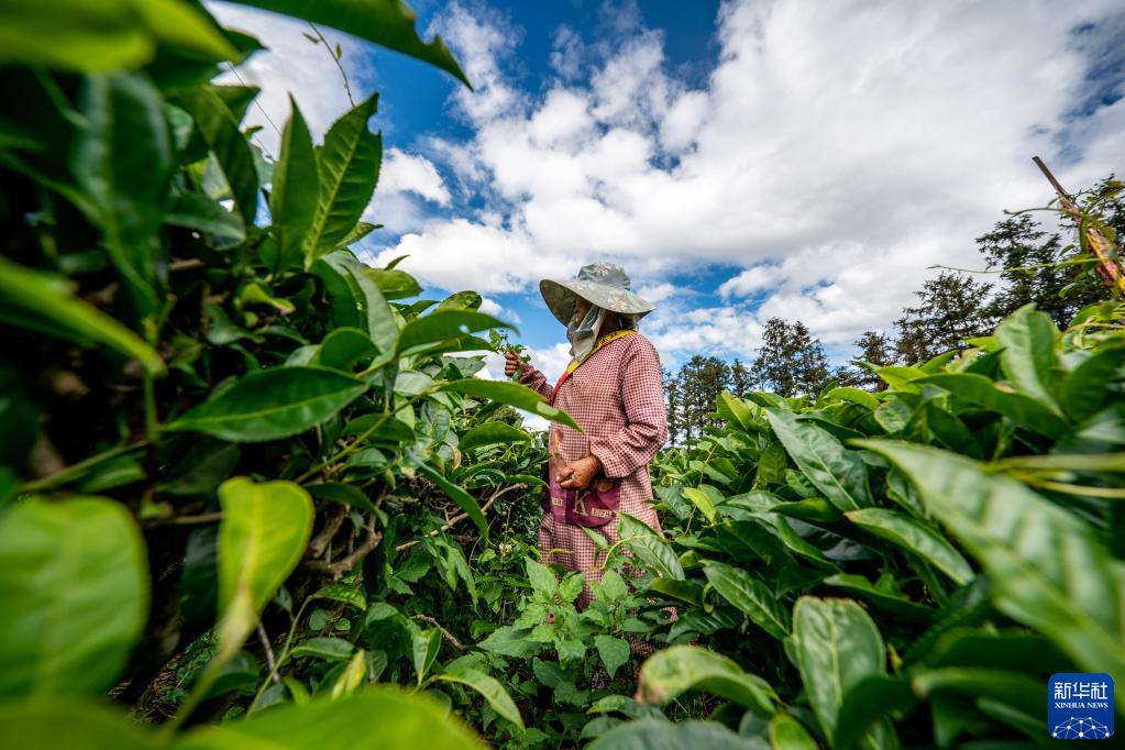 茶农在位于云南省西双版纳傣族自治州勐海县的国家种质大叶茶树资源圃采茶(5月10日摄)。新华社记者江文耀摄