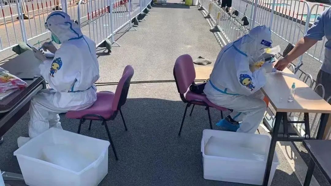 五个小时核酸样本采集结束了,在椿树文化广场核酸采集点,北京友谊医院消化分中心医生李纯,与同伴们卸下严密包裹数小时的“战袍”,早已是汗流浃背。