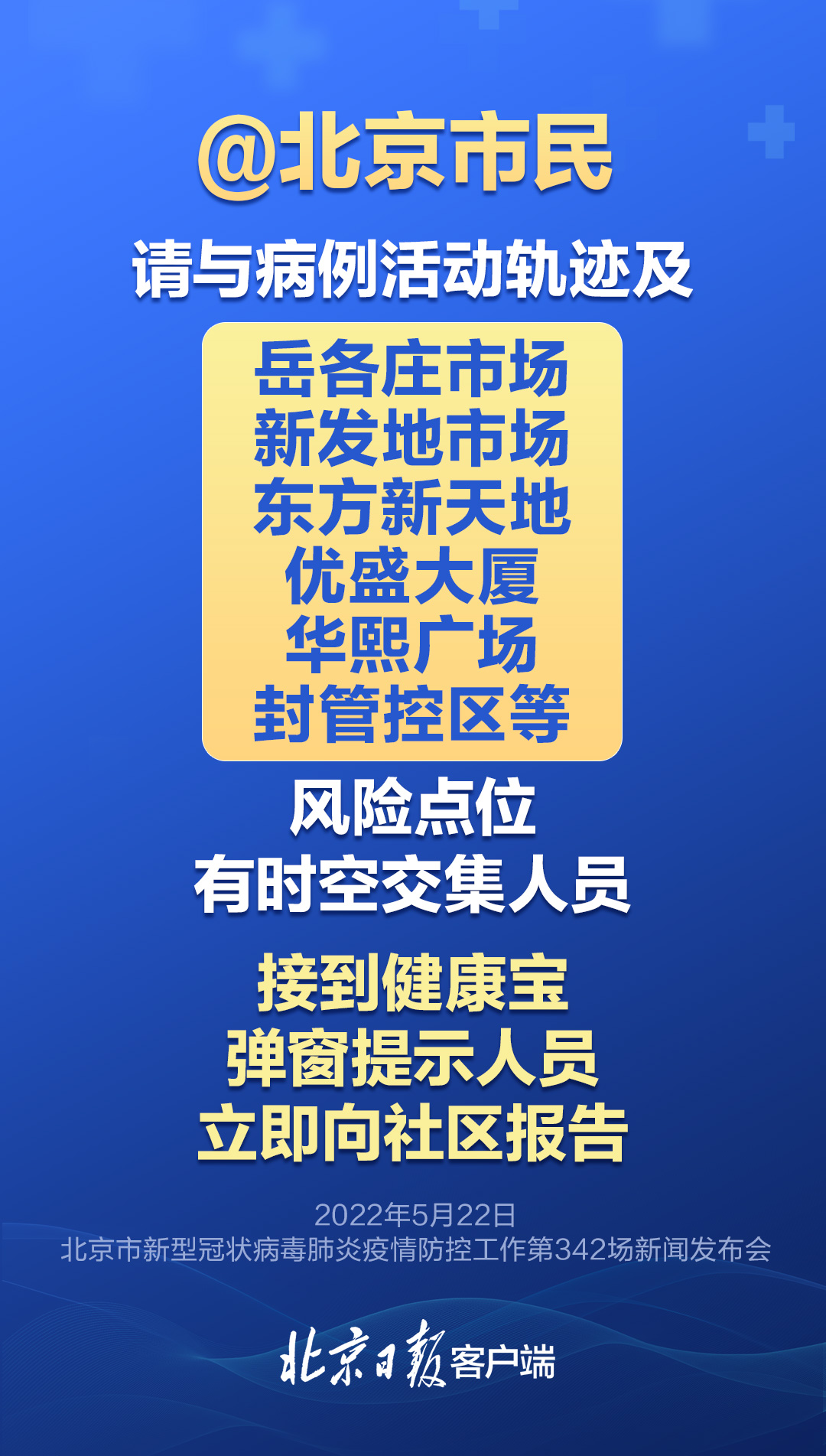 5月22日,在北京市新型冠状病毒肺炎疫情防控工作第342场新闻发布会上,市疾控中心副主任刘晓峰介绍,请与官方公布的病例活动轨迹及岳各庄市场、新发地市场、东方新天地、优盛大厦、华熙广场、封管控区等风险点位有时空交集人员、接到健康宝弹窗提示人员立即向社区报告,配合落实各项防控措施。
