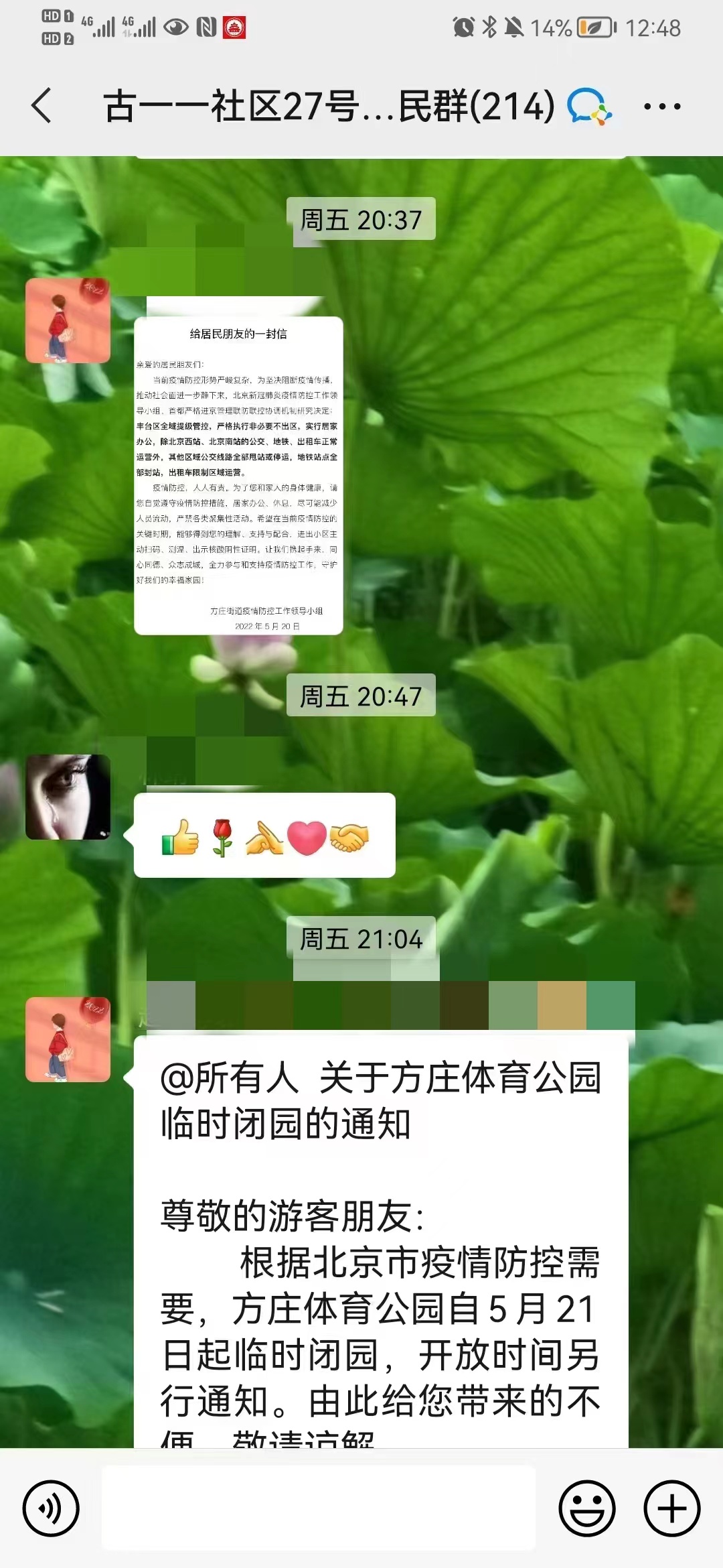 “方庄体育公园已经临时闭园了,大家别去了,在家好好待着吧!”丰台区方庄街道芳古园一区第一社区27号楼的居民微信群中,居民们自发地传递着慢下来的讯息。丰台区全域提级管控,方庄街道充分利用覆盖87%住户的“掌上四合院”微信群,喊居民慢下来。