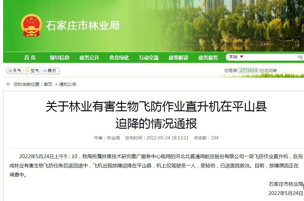 2022年5月24日上午9:10,我局所属林果技术研究推广服务中心租用的河北北直通用航空股份有限公司一架飞防作业直升机,在完成林业有害生物飞防任务后返回途中,飞机出现故障迫降在平山县,机上仅驾驶员一人,受轻伤,已送医院救治。目前,故障原因正在调查中。