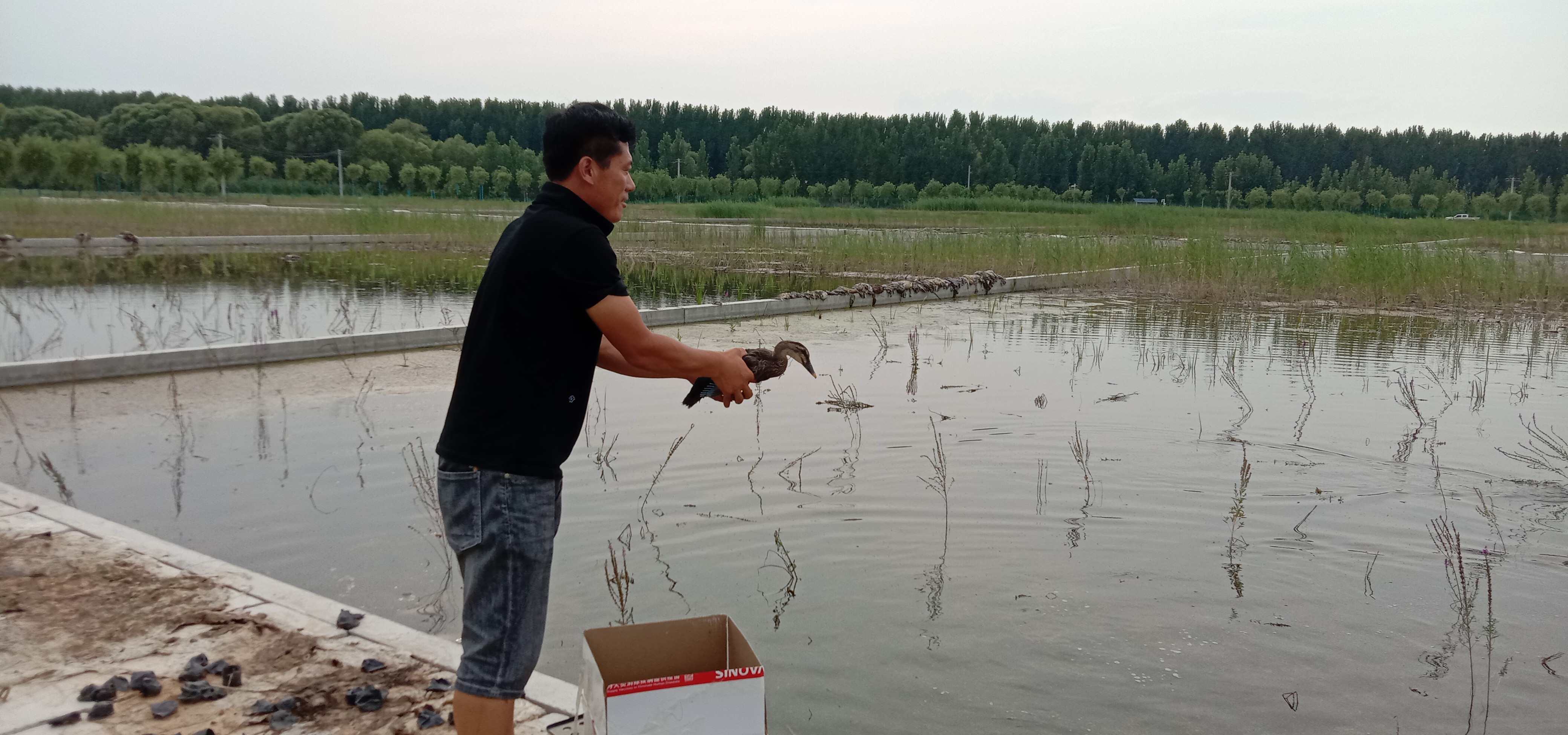 韩战桥精心照料成功孵化出的这8只斑嘴鸭,每天把卷心菜切成碎末拌在饲料里,偶尔还去早市上买些小鱼给它们加强营养。到了夏季,韩战桥带它们来到孝义河湿地“下水”。刚开始“小可爱”们不敢动,一直在岸边徘徊,直到其中一只个头大一些的斑嘴鸭下水后,其他几只才纷纷下水。“斑嘴鸭到了水里适应得非常快,马上就能大口大口地觅食昆虫,欢快地在水里翻滚玩耍,还不停地梳理自己的羽毛。”韩战桥的介绍中掩饰不住喜悦和自豪。