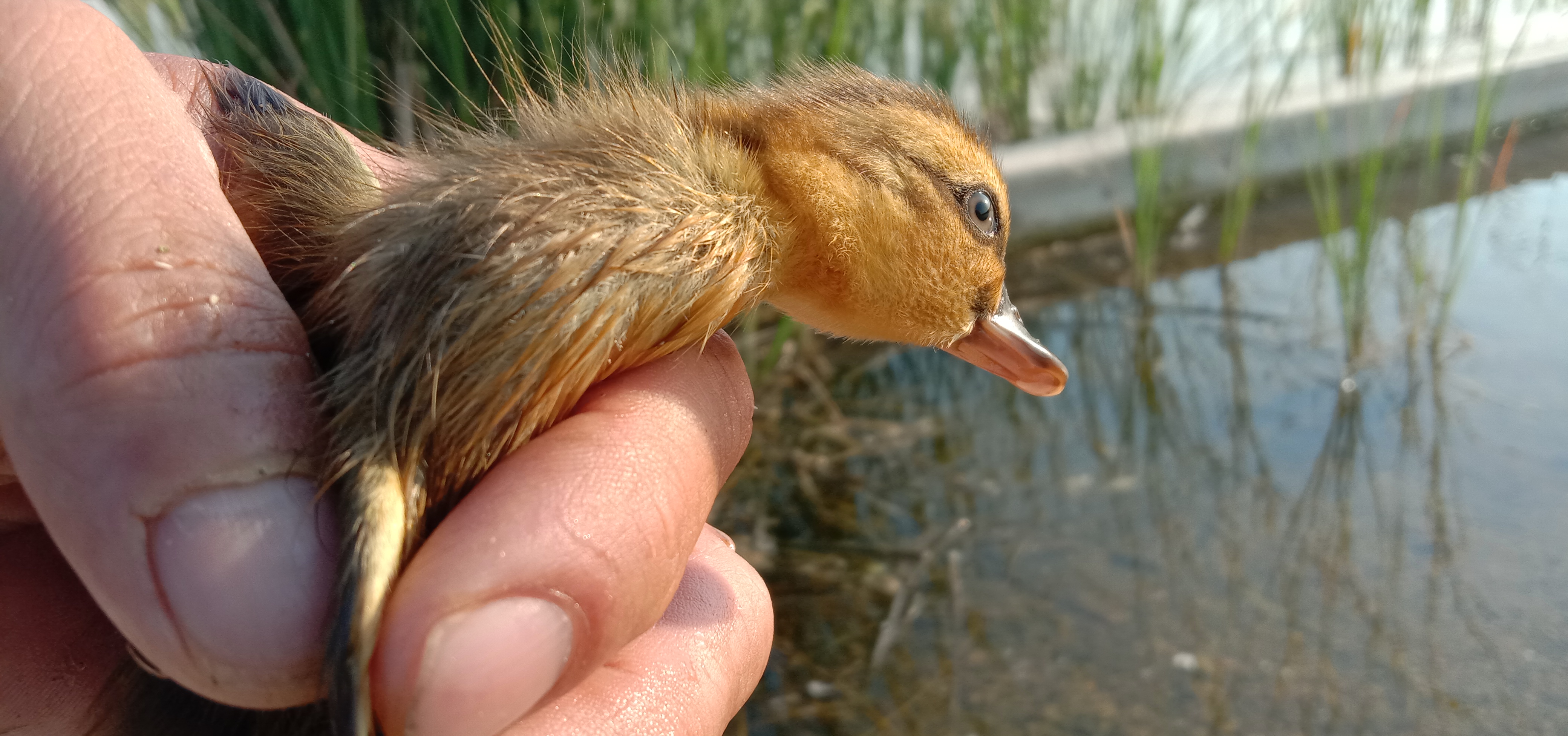 紧接着,又有6只斑嘴鸭陆续出壳。其中有一只差点“夭折”。这只小鸟从蛋壳里出来时,没能脱落另一半蛋壳,在剩了一半的蛋壳中挣扎了两天还是无法站起来,羽毛已经发干,粘在蛋壳上,不停地哀叫。韩战桥急得直搓手,最后他决定帮助它“人工分娩”。这只小斑嘴鸭全身的皮肤是透明的,太娇嫩了,韩战桥小心翼翼帮它把羽毛一点一点地和蛋壳剥离开,生怕给它带来伤害,最后这只“小可爱”终于站起来了,和其他小伙伴一样健康地成长起来。