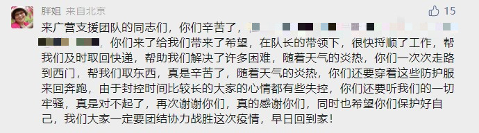 居民也将大家的辛苦看在眼里、疼在心里,一件件物资送到他们手中,空着的是收件人姓名,装满的是来自居民们沉甸甸的爱。