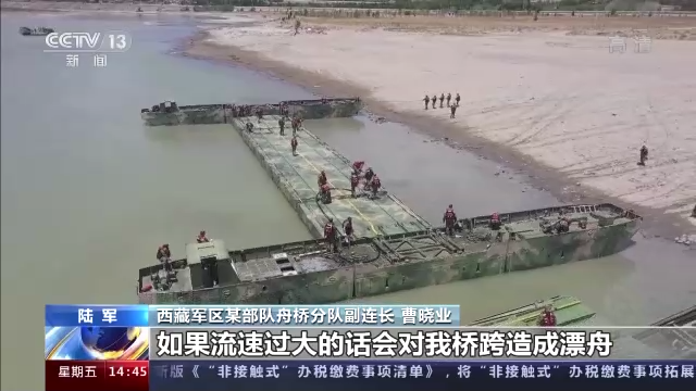 西藏军区某部队舟桥分队副连长 曹晓业:现在的流速为2.5米/秒,如果流速过大的话会对我桥跨造成漂舟,导致水上动力不足。