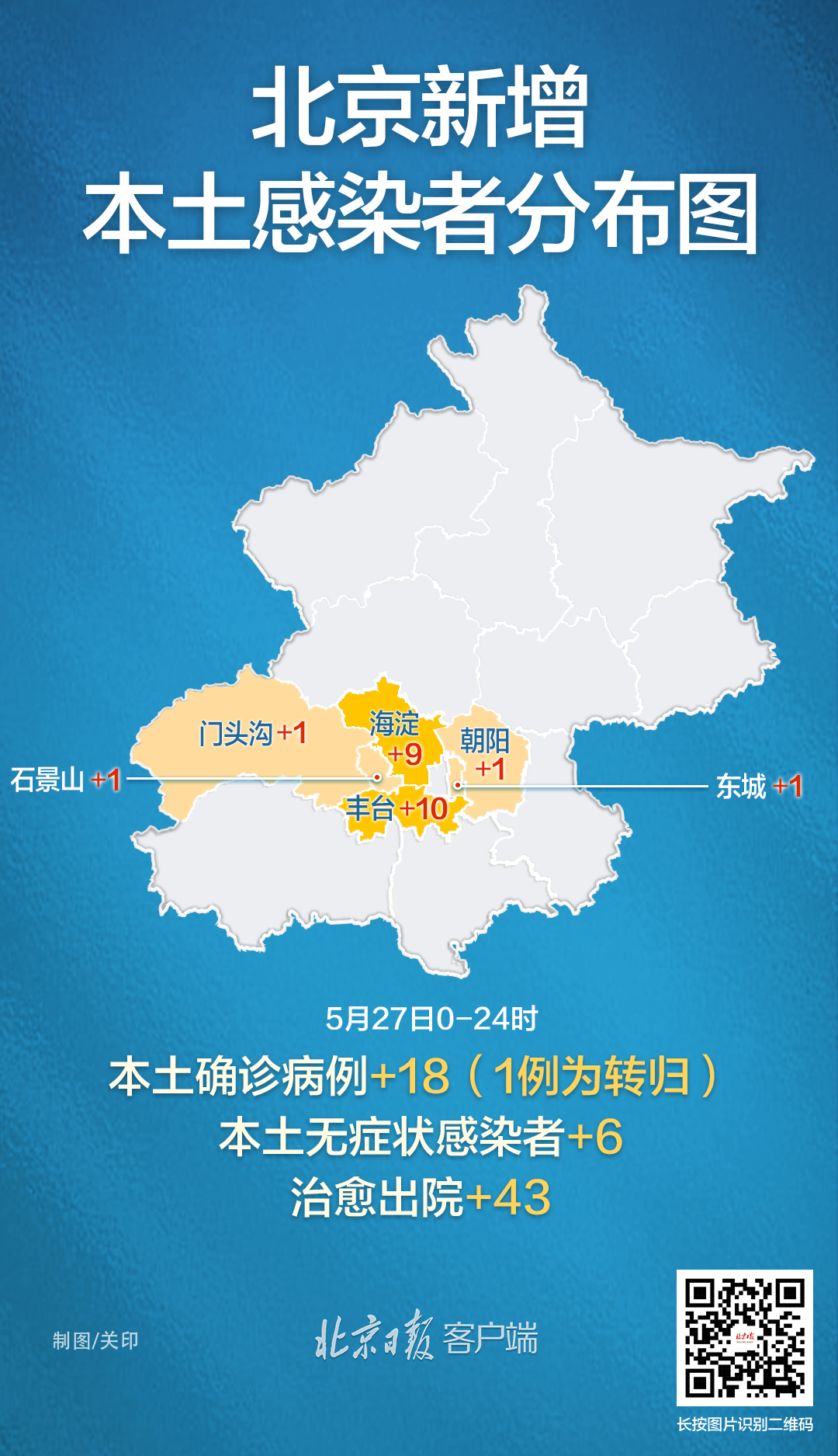 5月27日0时至24时,北京新增18例本土确诊病例(含1例无症状感染者转确诊病例)和6例无症状感染者,无新增疑似病例;新增2例境外输入确诊病例和3例无症状感染者,无新增疑似病例。治愈出院43例。