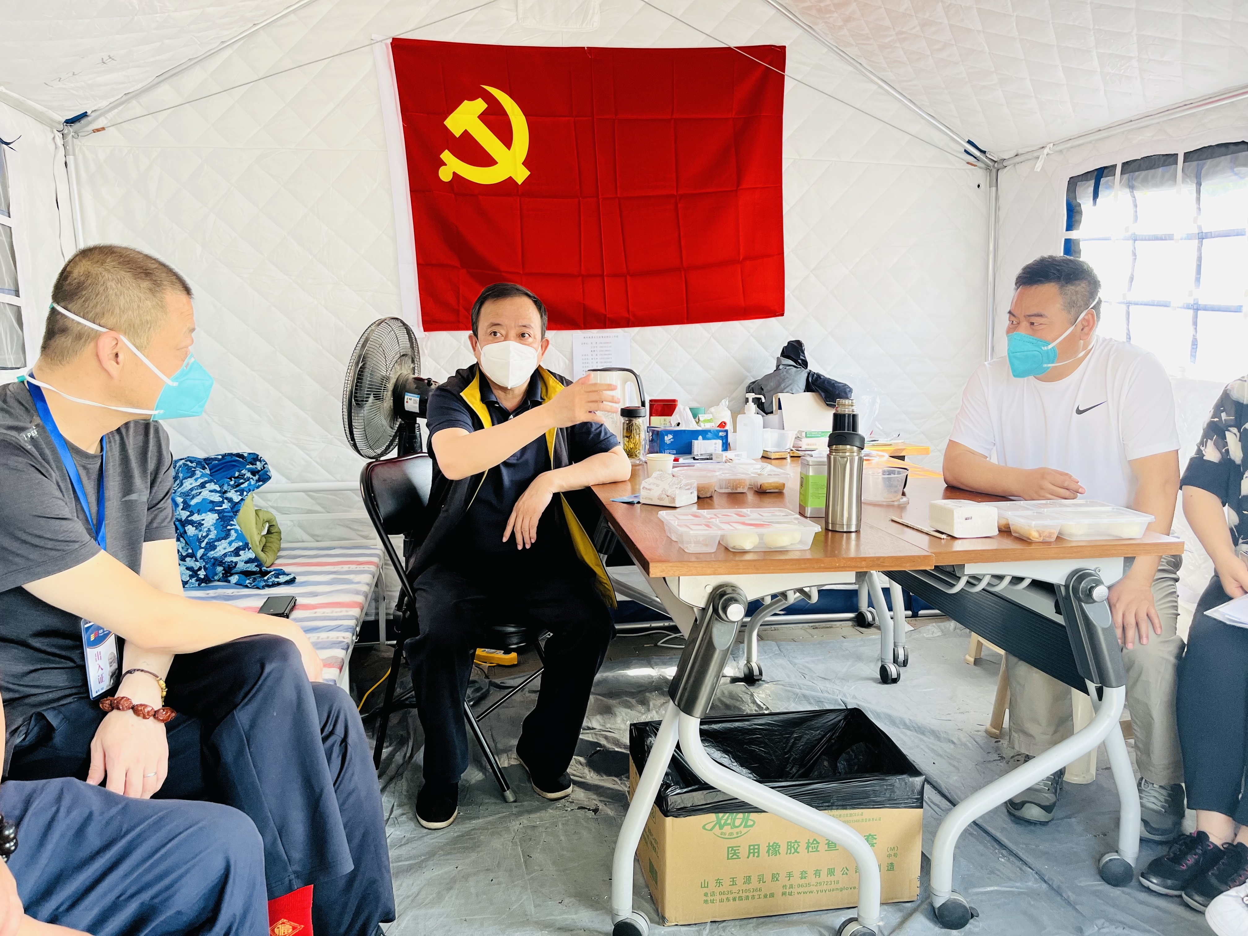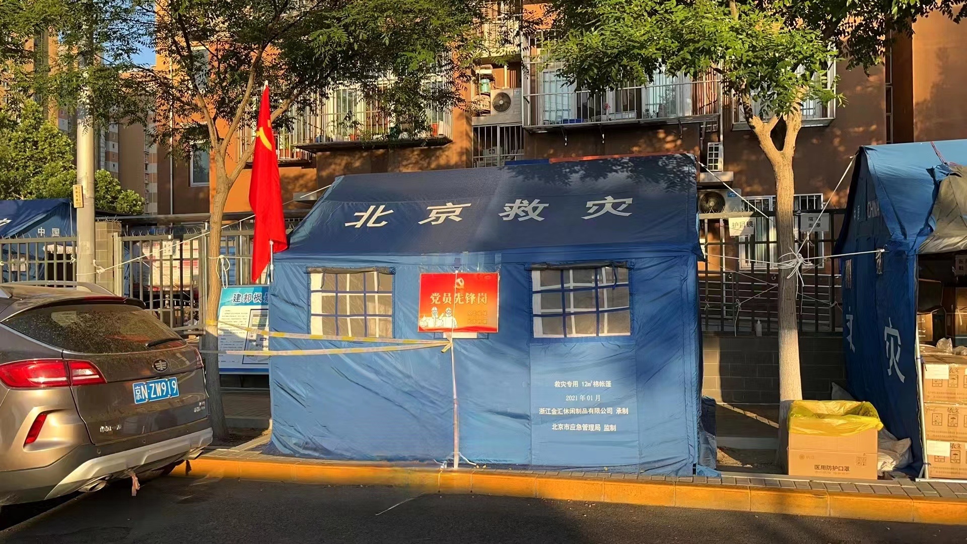 疫情防控指挥部的帐篷就扎在建邦枫景小区的东侧,外面有建邦枫景小区情况介绍和民生保障的展板,帐篷上挂着党员先锋岗的标牌,帐篷里面悬挂着鲜红的党旗。