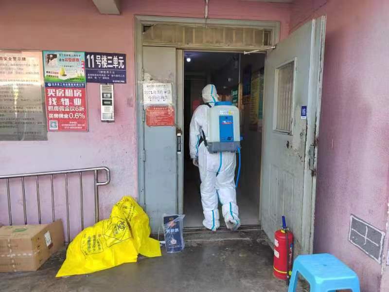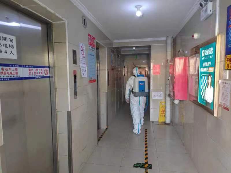 在封控区域一个重要环节就是消杀,负责消杀的“大白”每次要穿戴好各种防护装备,再背上几十斤重的喷雾箱进行消杀作业,连日来,30名“大白”消杀专员对小区内的楼道、地面、扶手、门把手、电梯内外等居民经常接触的公共设施按时进行喷洒消杀。在完成终末消杀后,“大白”们还要对设备和自身进行消杀,并按照规范流程脱下防护服,分类放在医疗垃圾袋内,做好最后的扫尾工作。
