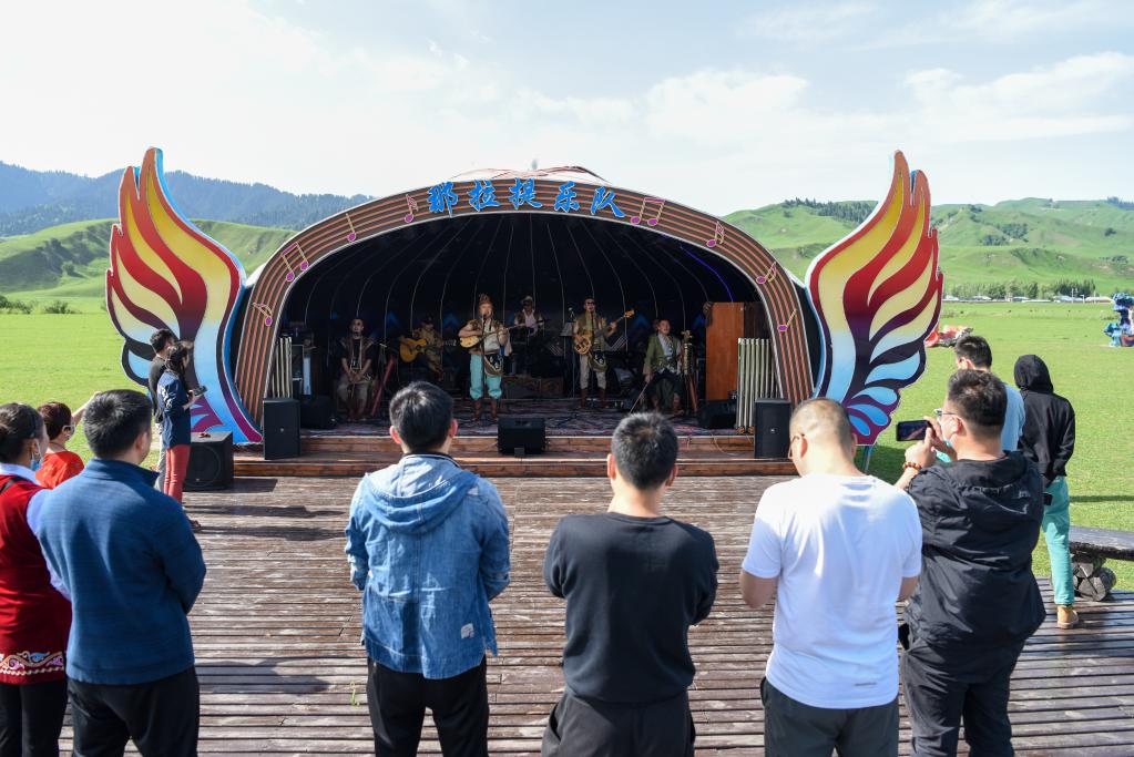 在新疆那拉提旅游风景区,由多民族成员组成的那拉提乐队为游客演绎不同风格的音乐(2021年6月3日摄)。新华社记者 丁磊 摄