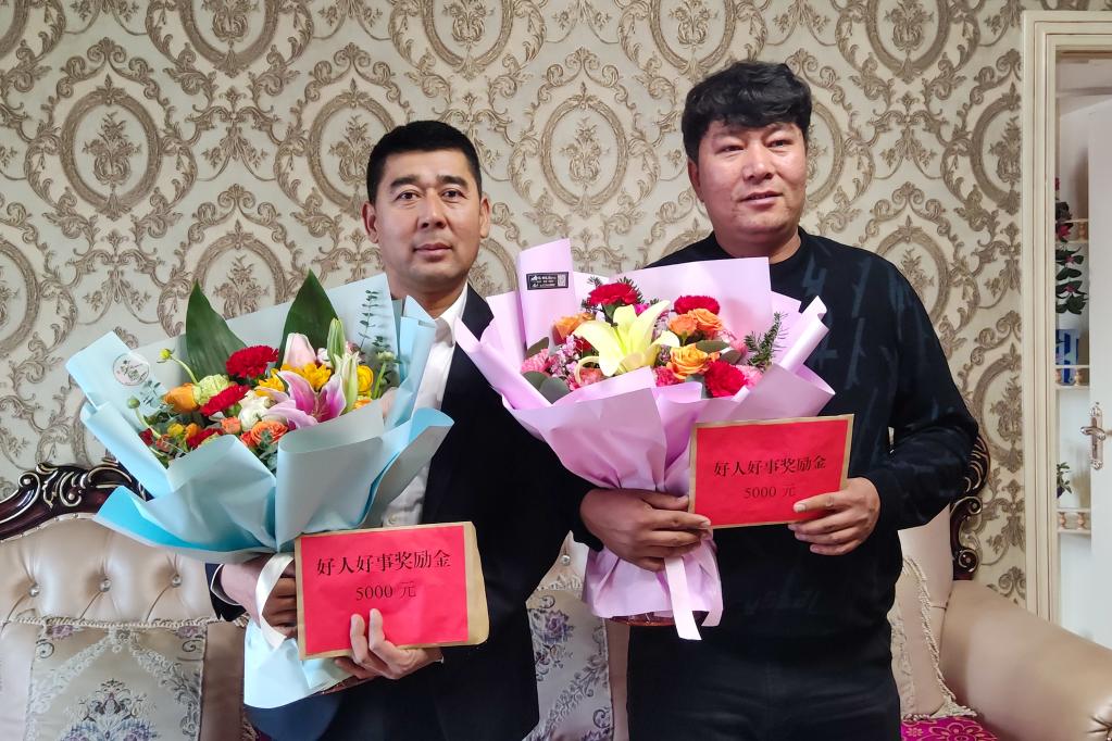 新疆库尔勒市货运司机曼苏尔·帕塔尔(右)和买买提·努尔东收到来自江苏省徐州市的特殊感谢信(2022年1月6日摄,手机照片)。新华社发(黄万里 摄)