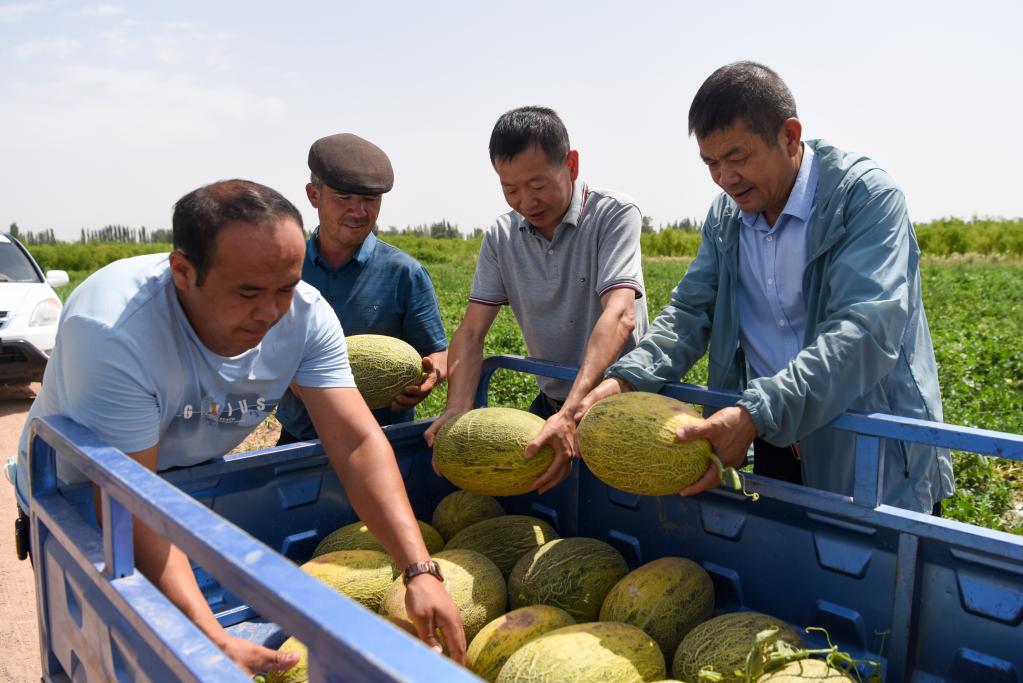 在新疆喀什地区伽师县卧里托格拉克镇,广东援疆佛山驻伽师工作队的干部帮助农户采收伽师瓜(2021年7月11日摄)。新华社记者 丁磊 摄