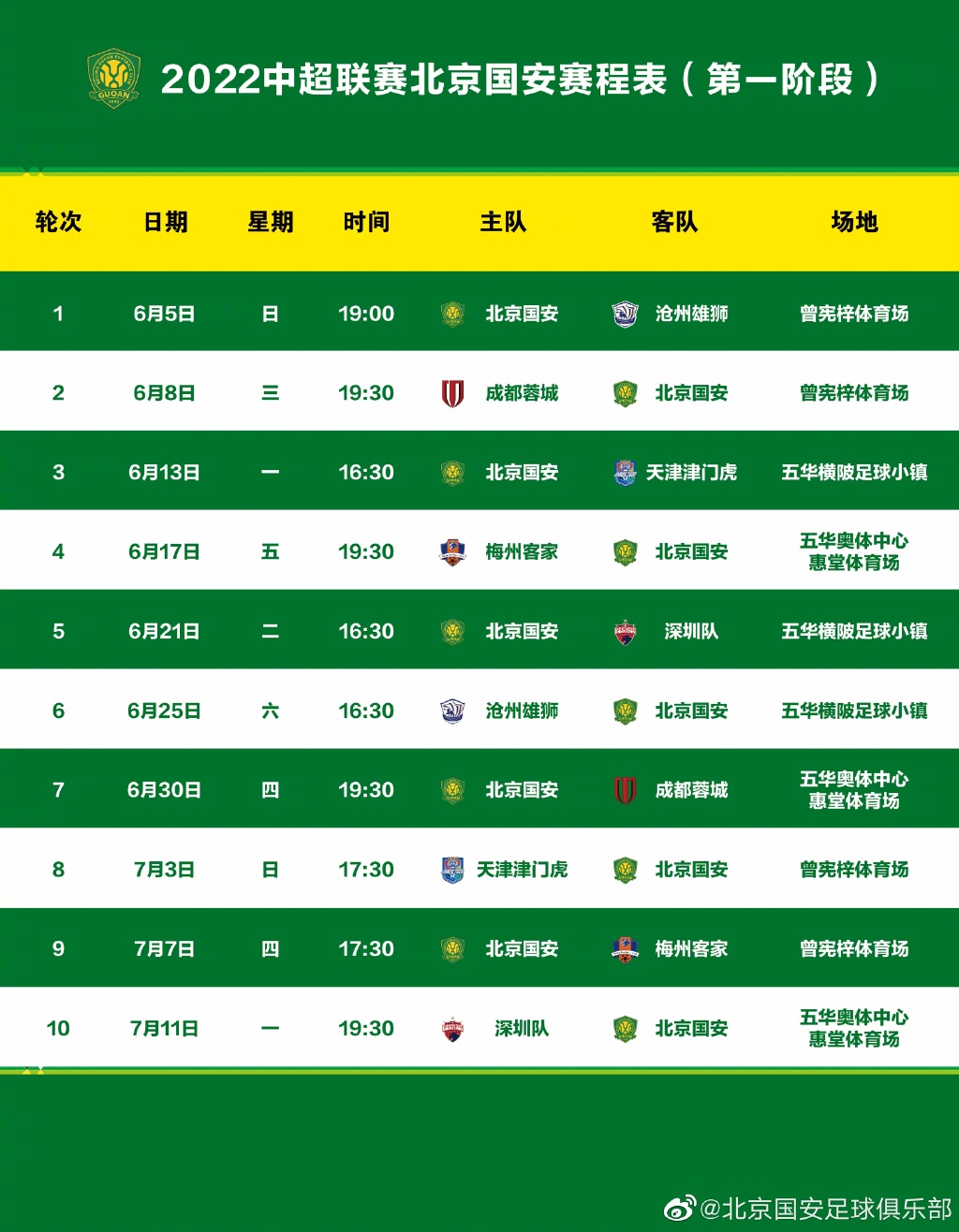 北京国安队第一阶段赛程。图片来源:@北京国安足球俱乐部