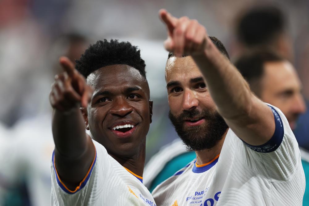 决赛进球功臣维尼修斯(左)与本泽马庆祝球队夺冠。图片来源:新华社