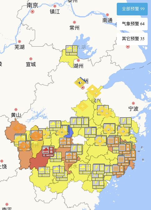 截至上午11时,浙江发布99条预警信号,其中遂昌将暴雨及山洪灾害风险预警升级红色,为最高等级。